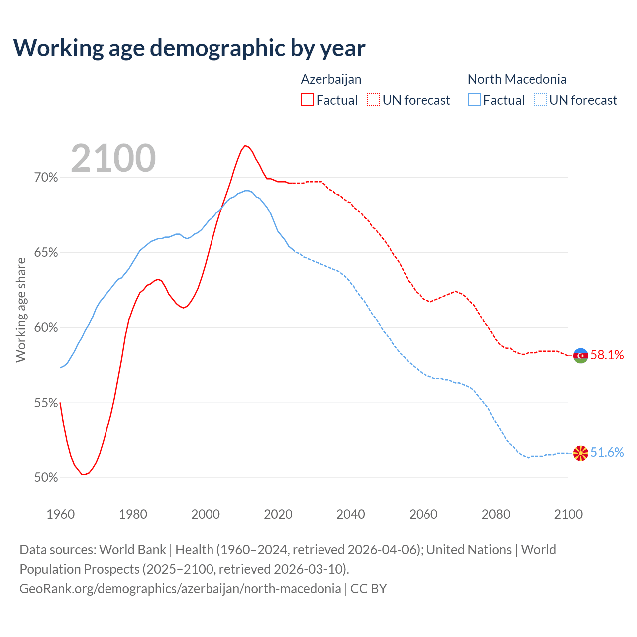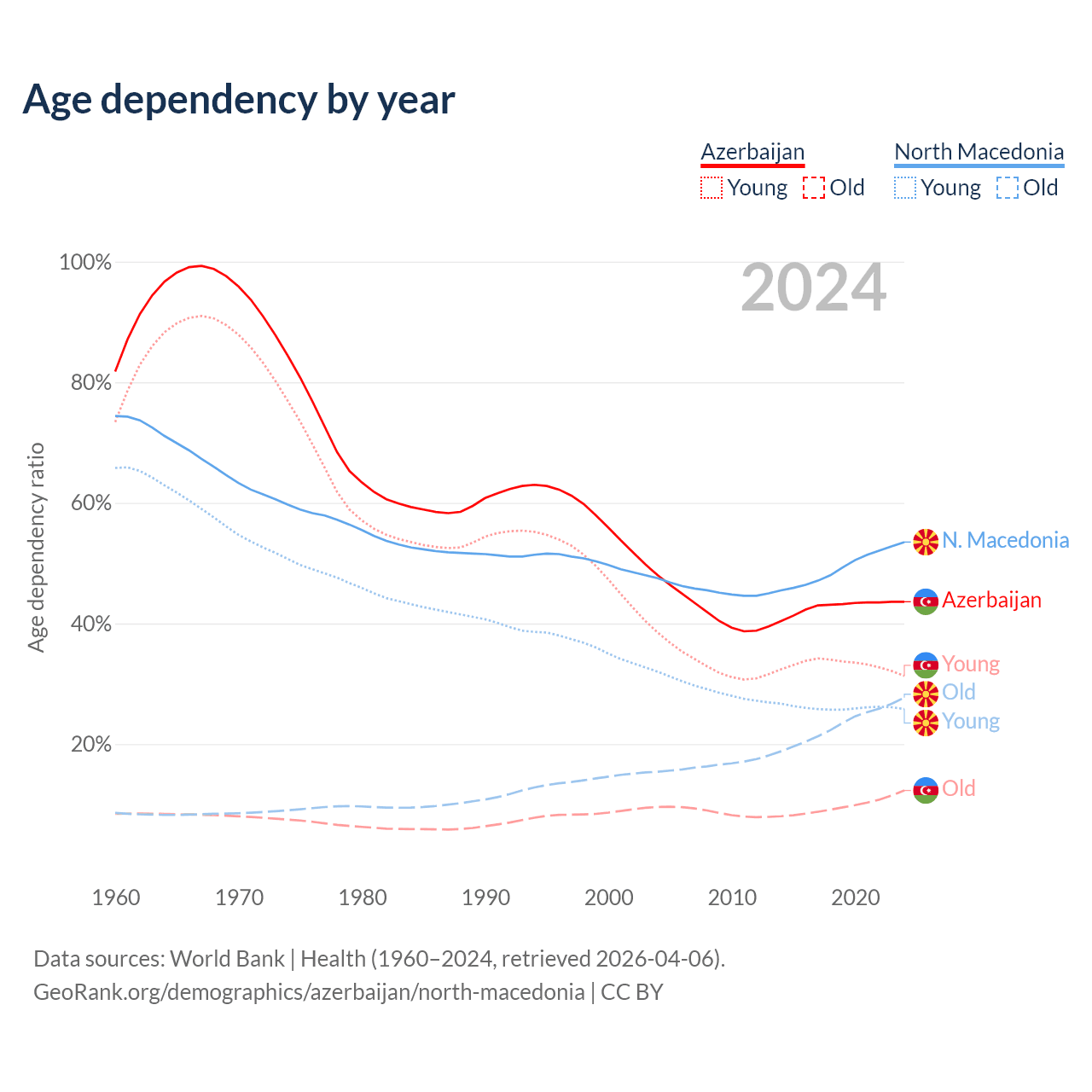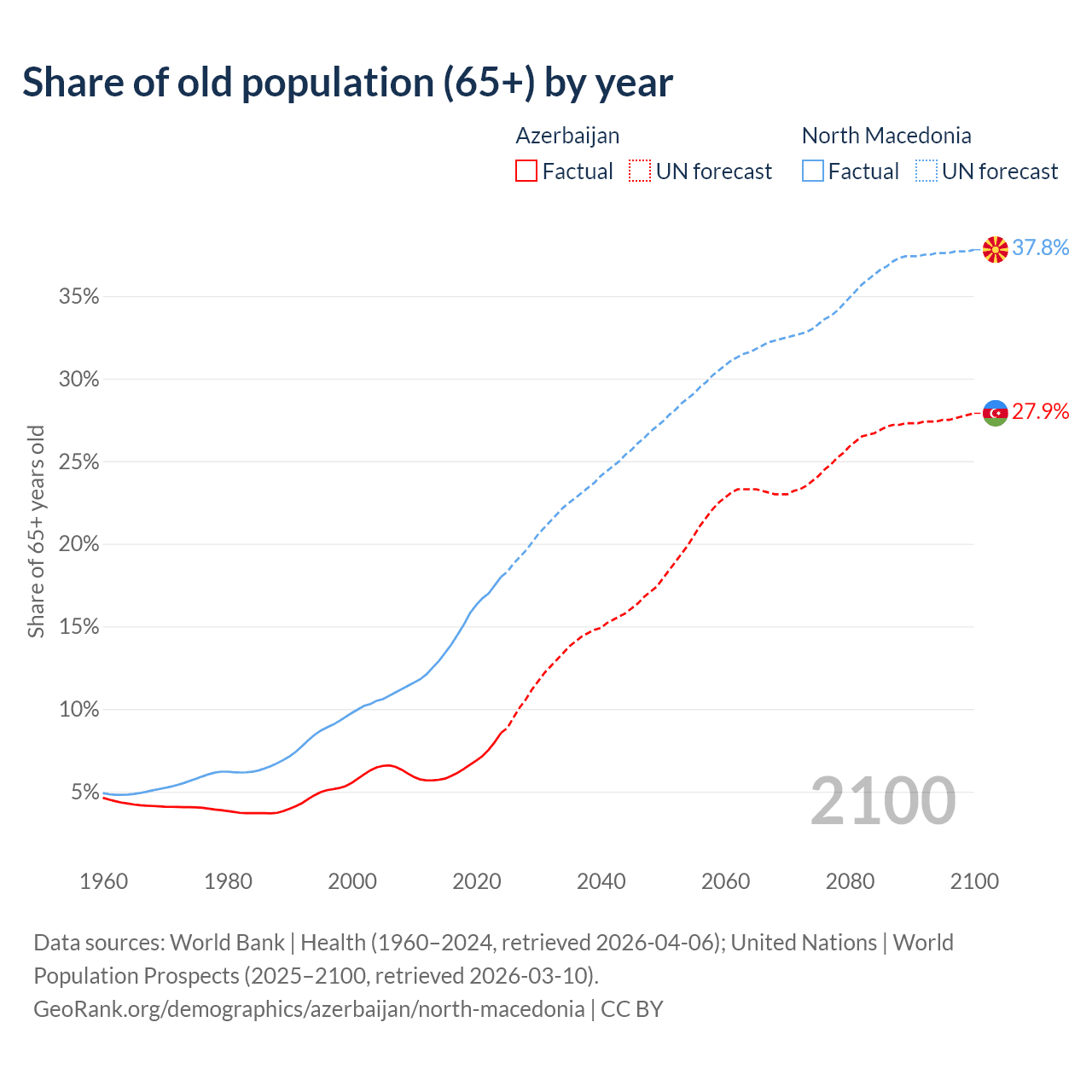 The share of older people aged 65 and over is 8.56% in Azerbaijan and 18% in North Macedonia. Life expectancy in Azerbaijan compared to North Macedonia .