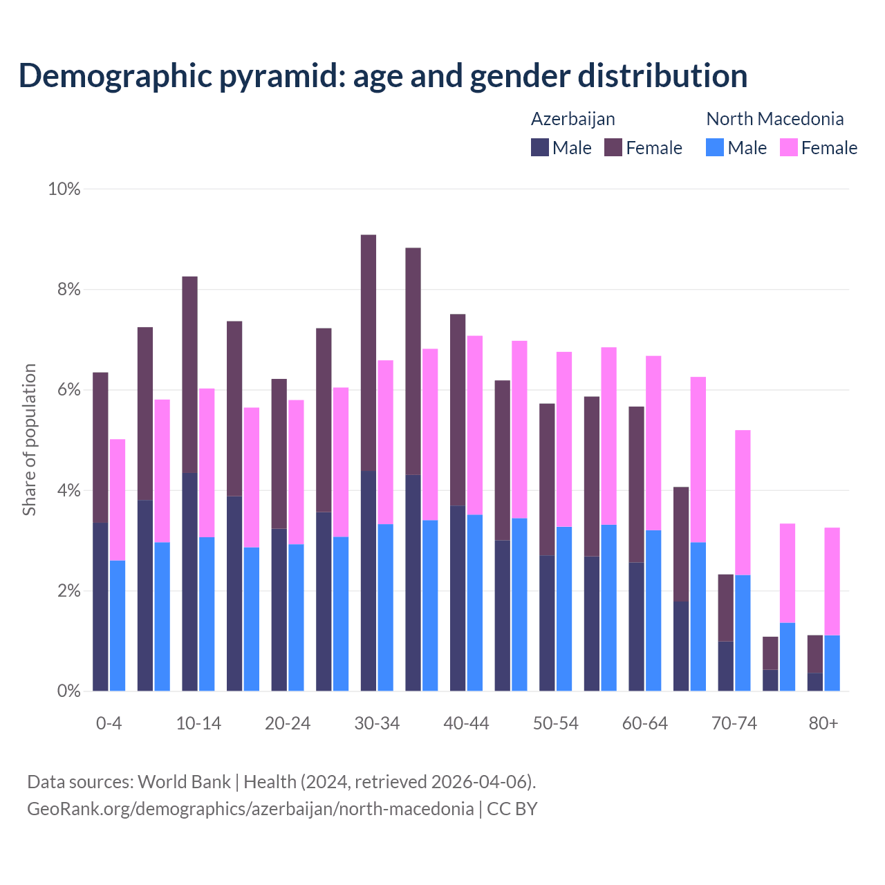 - Azerbaijan is ranked 82/196 by median age (oldest to youngest) vs 37/196 for North Macedonia.