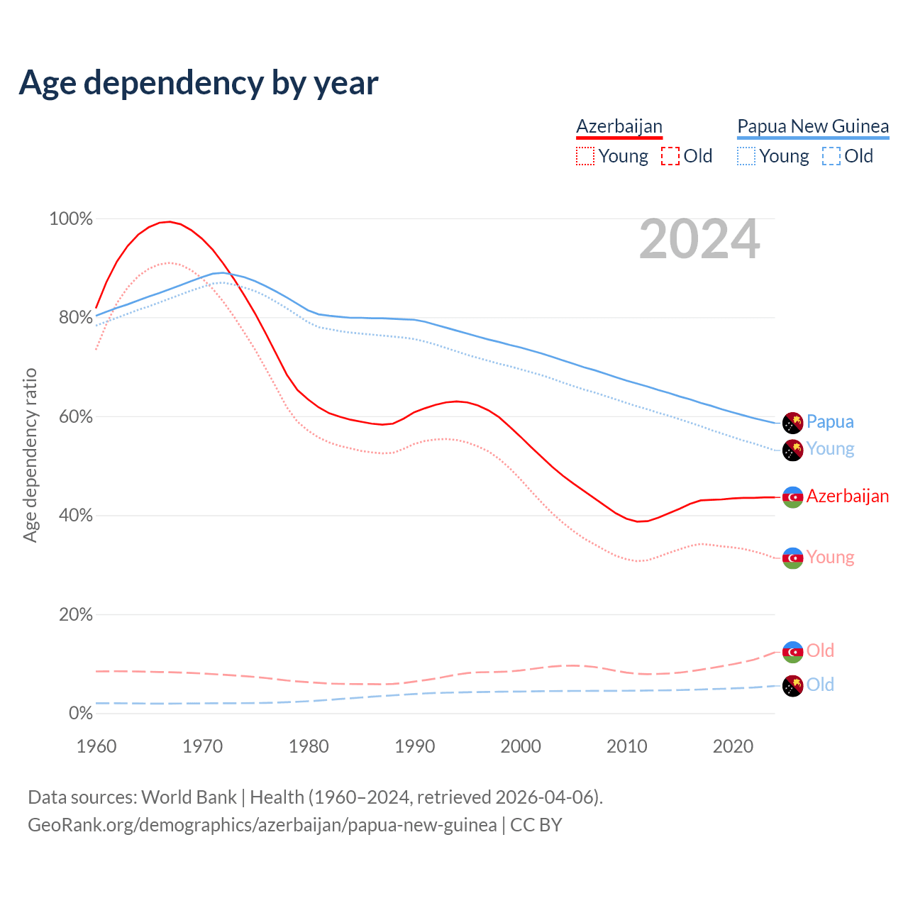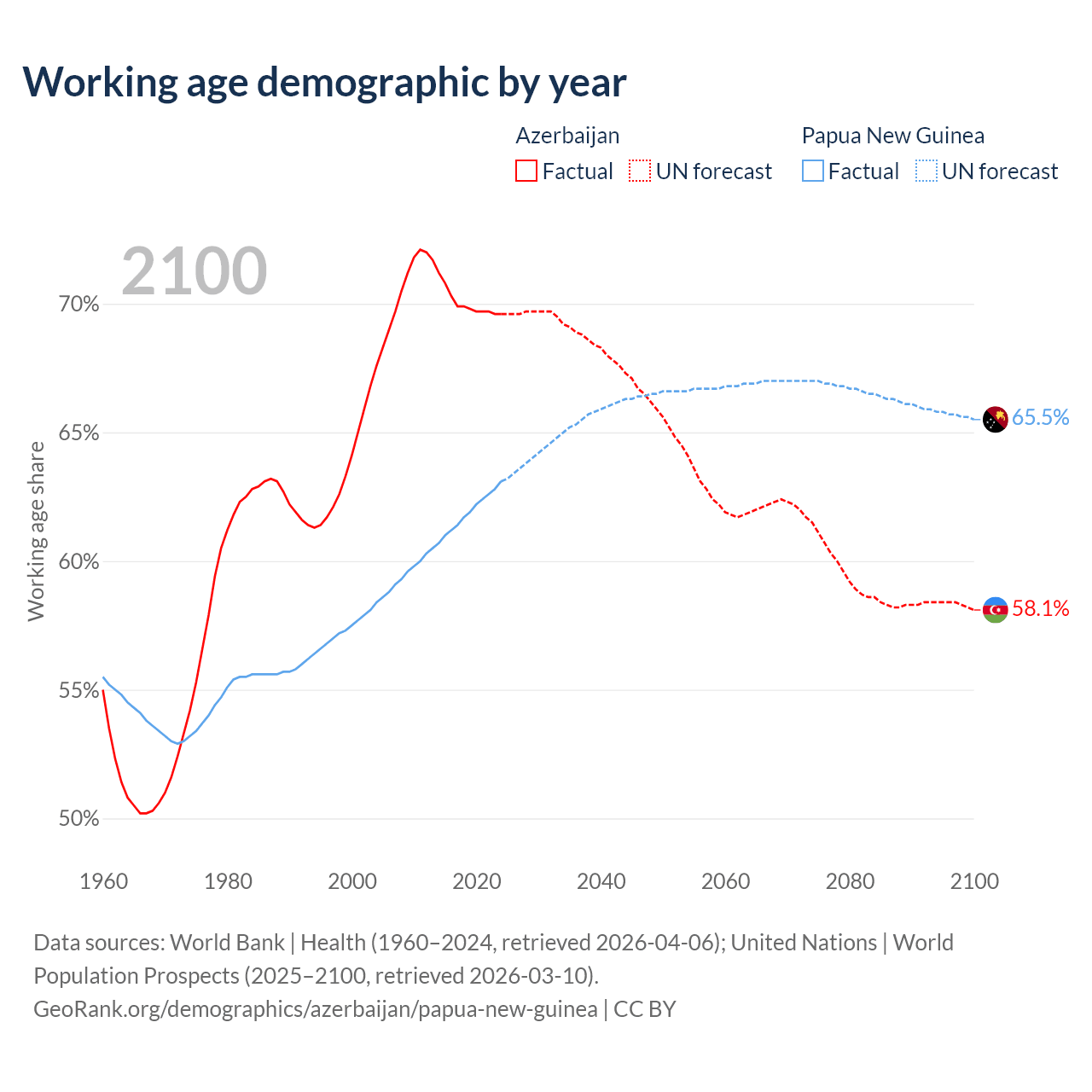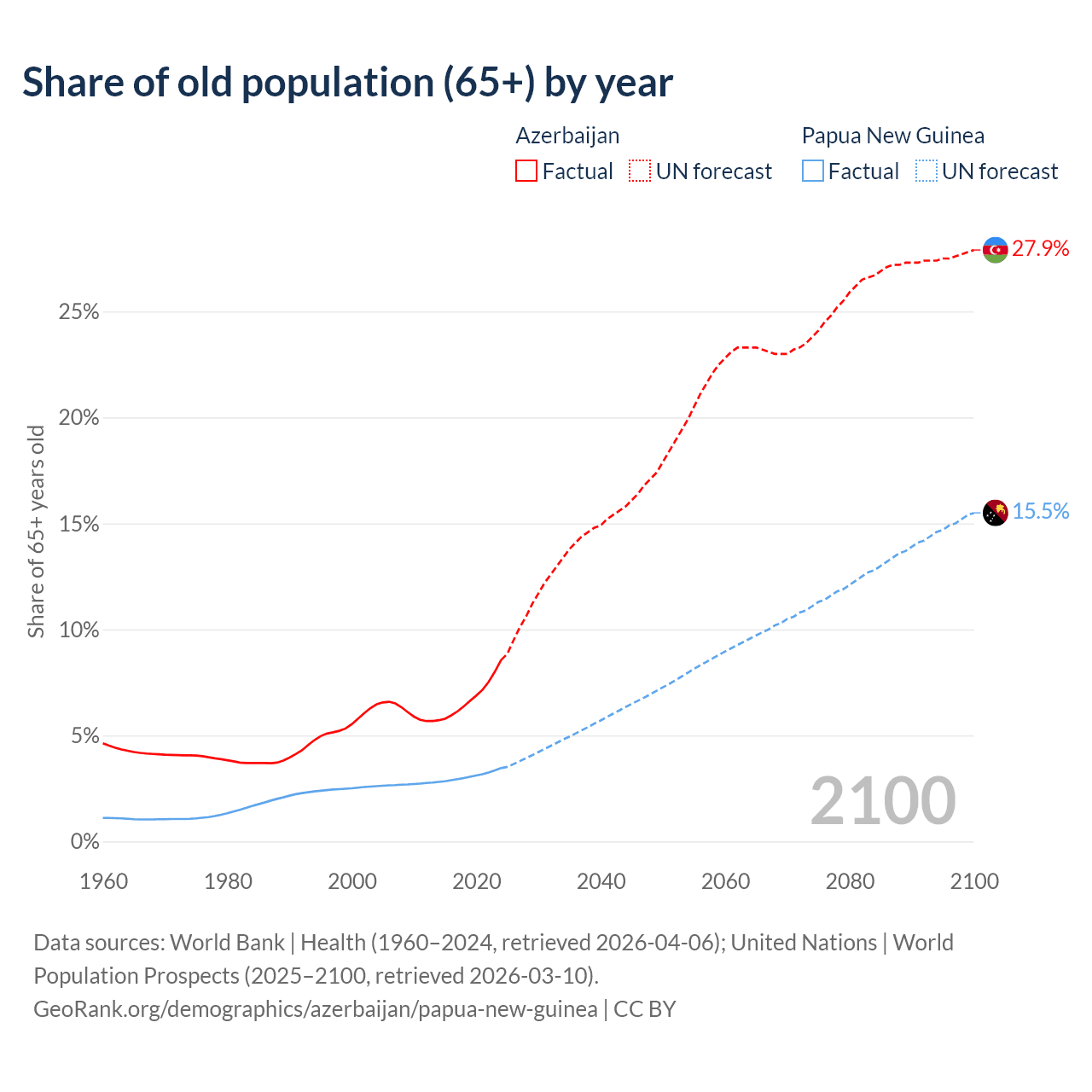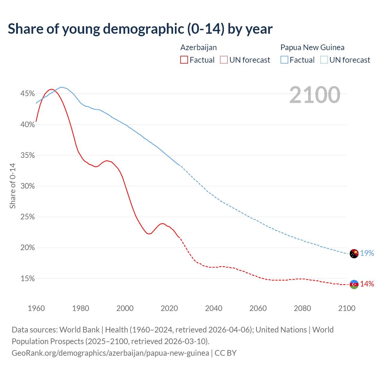 Median age Azerbaijan vs Papua New Guinea, 1960-2100