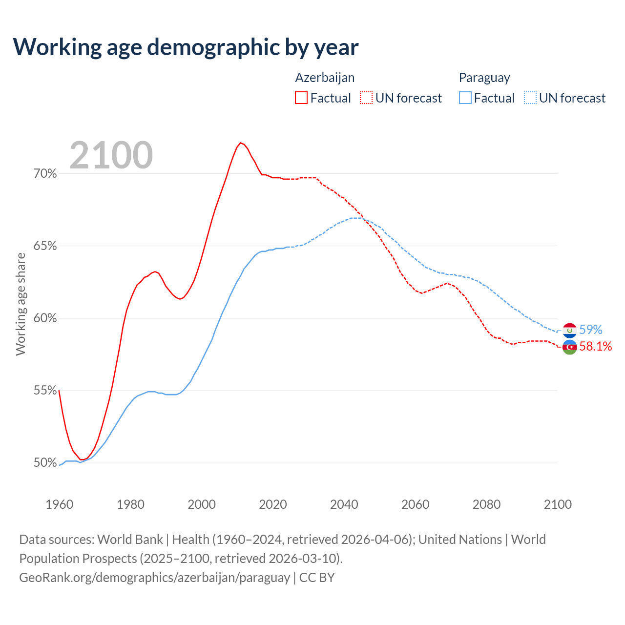 Median age Azerbaijan vs Paraguay, 1960-2100
