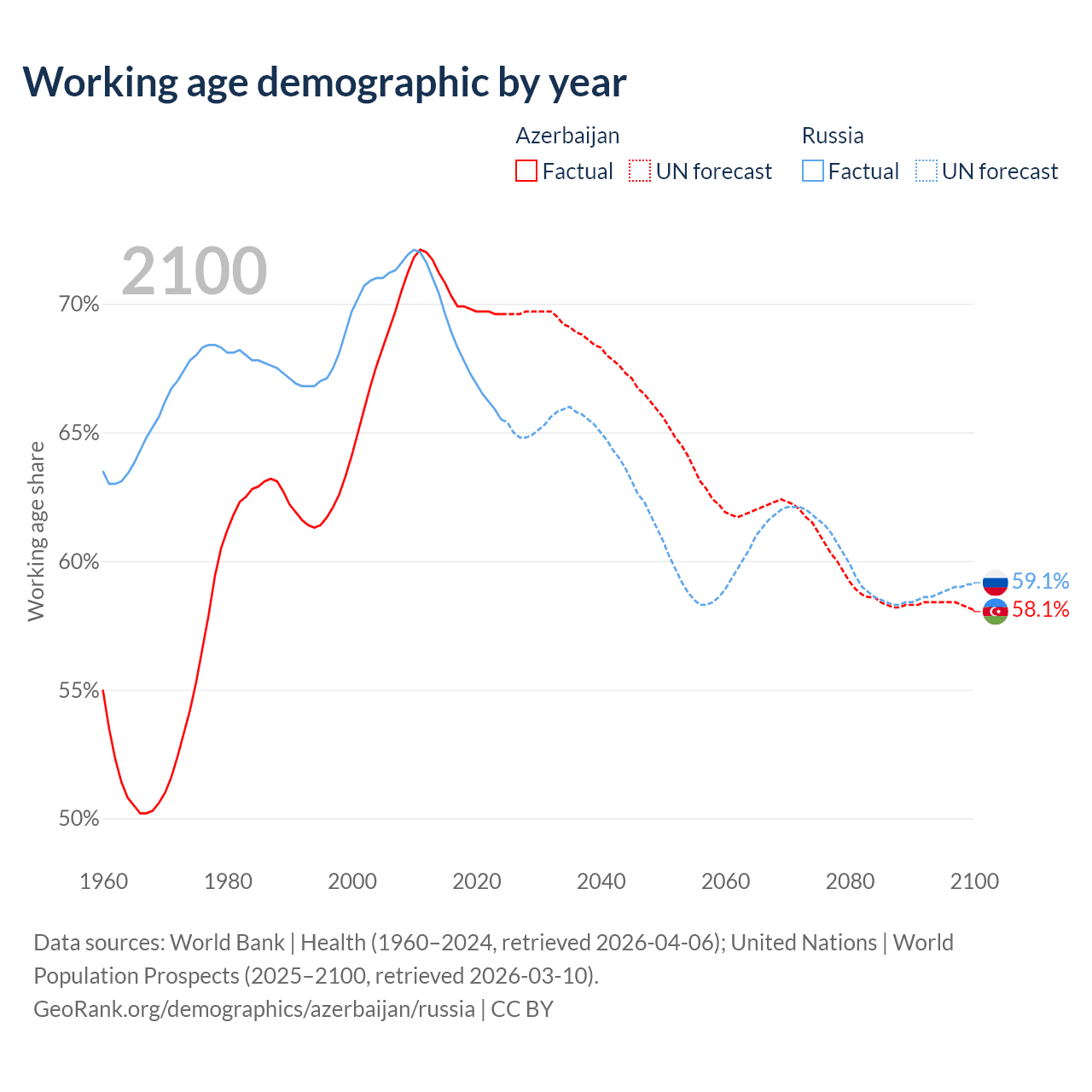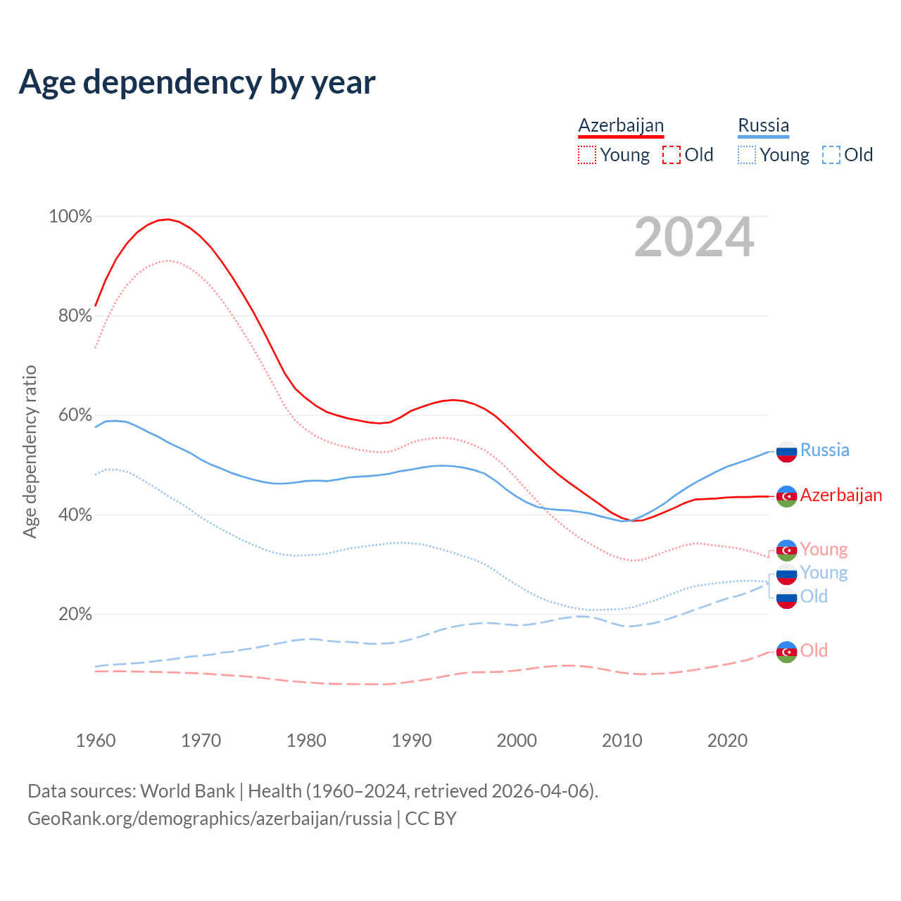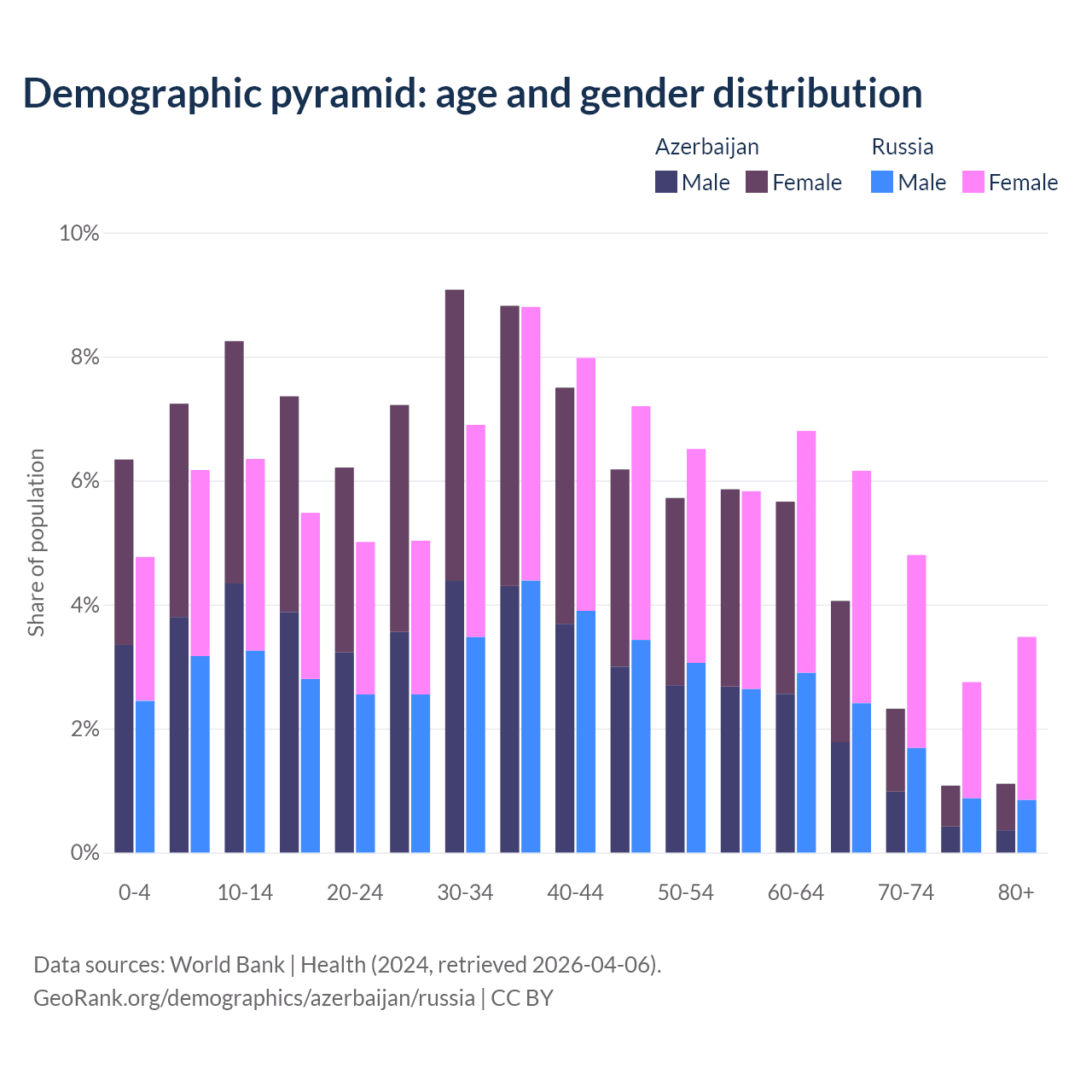 - Azerbaijan is ranked 82/196 by median age (oldest to youngest) vs 42/196 for Russia.