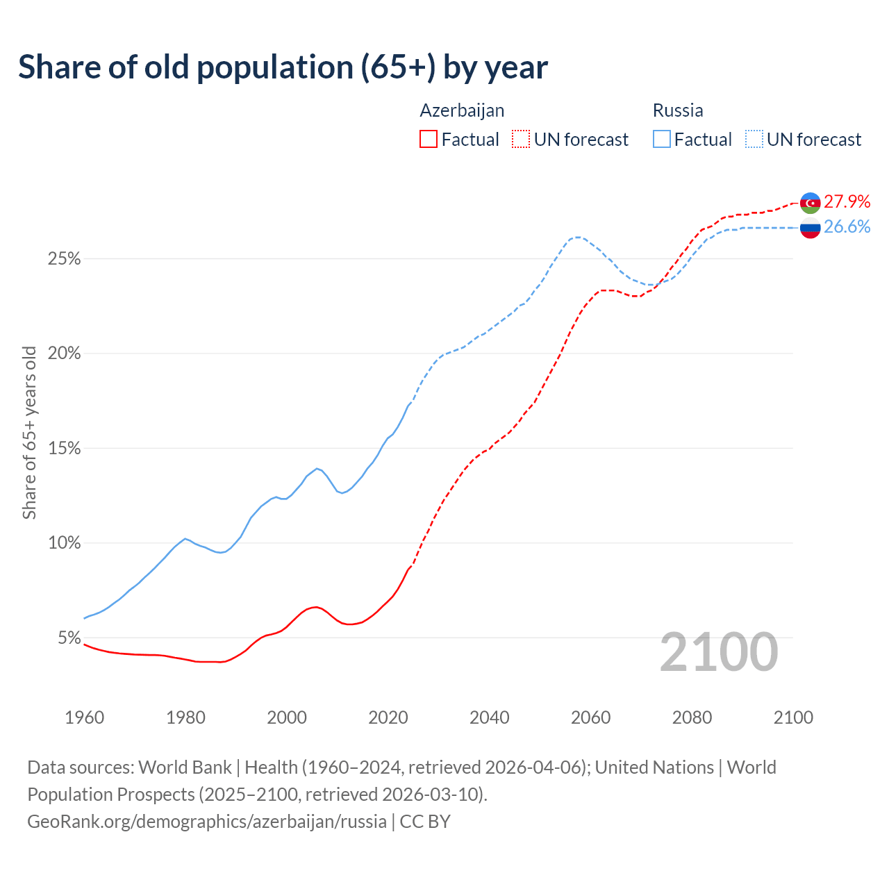 The share of older people aged 65 and over is 8.56% in Azerbaijan and 17.2% in Russia. Life expectancy in Azerbaijan compared to Russia .