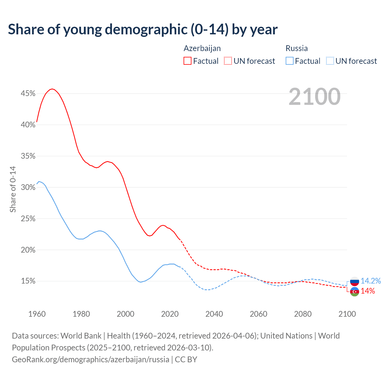 - As of 2026, the population of Azerbaijan is 10.3M vs 142M in Russia - 13.7 times difference.