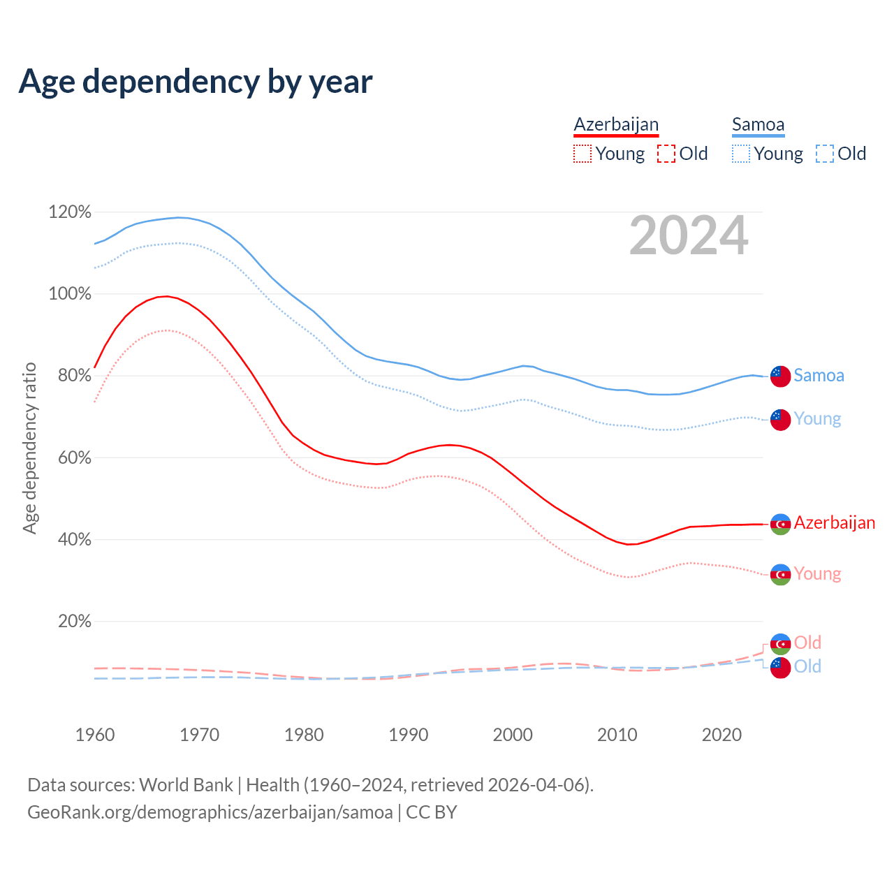 - The share of old-age demographic (65+) in Azerbaijan is 8.56% vs 5.88% in Samoa.