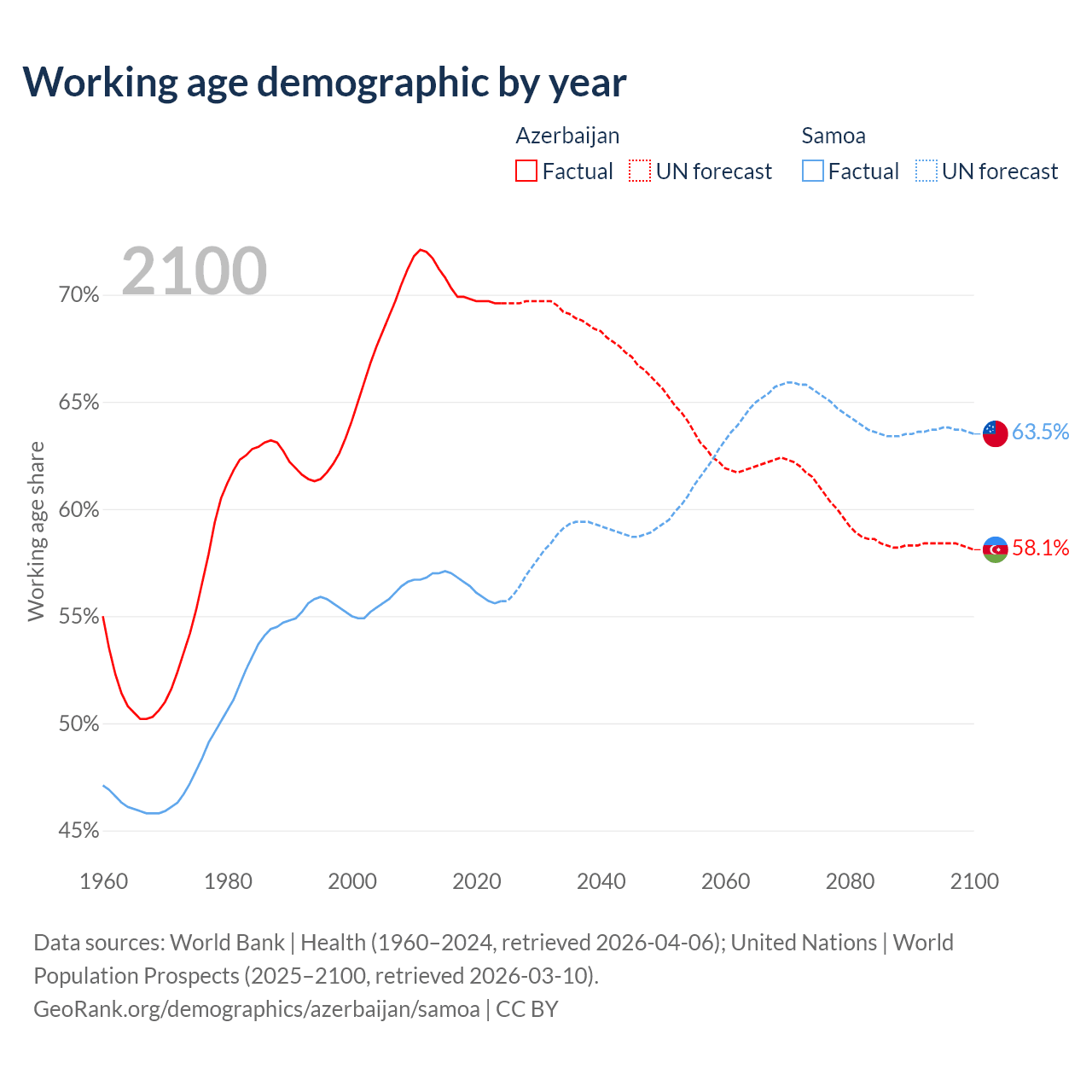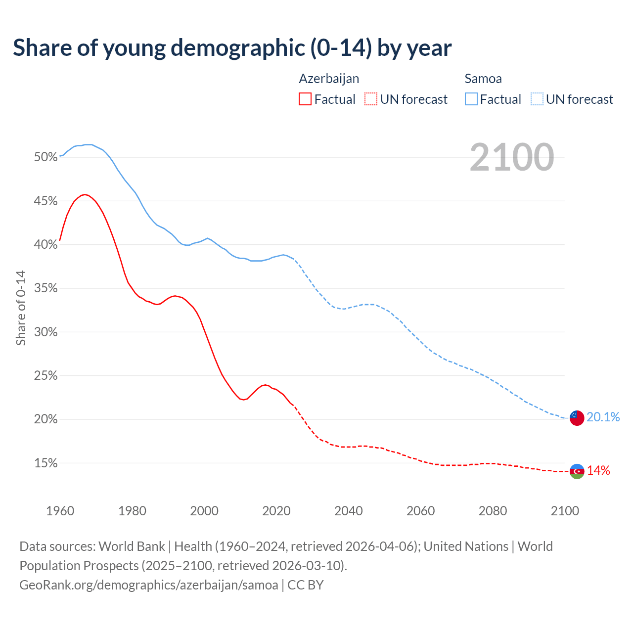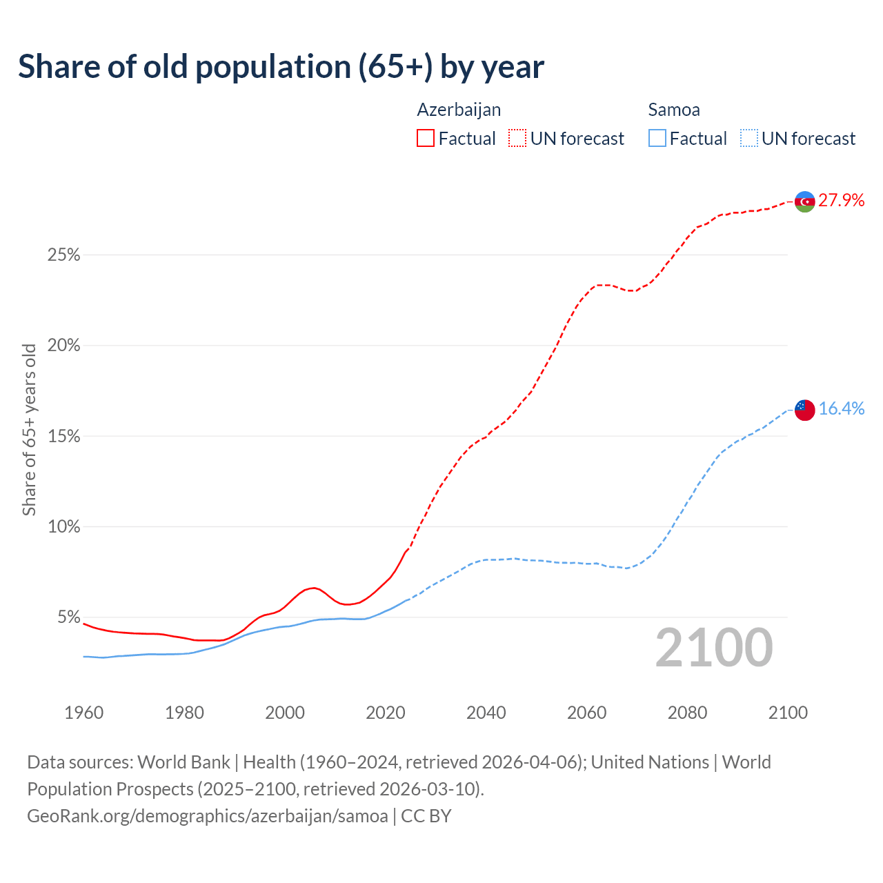 Median age Azerbaijan vs Samoa, 1960-2100