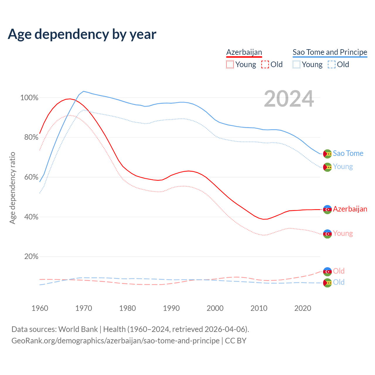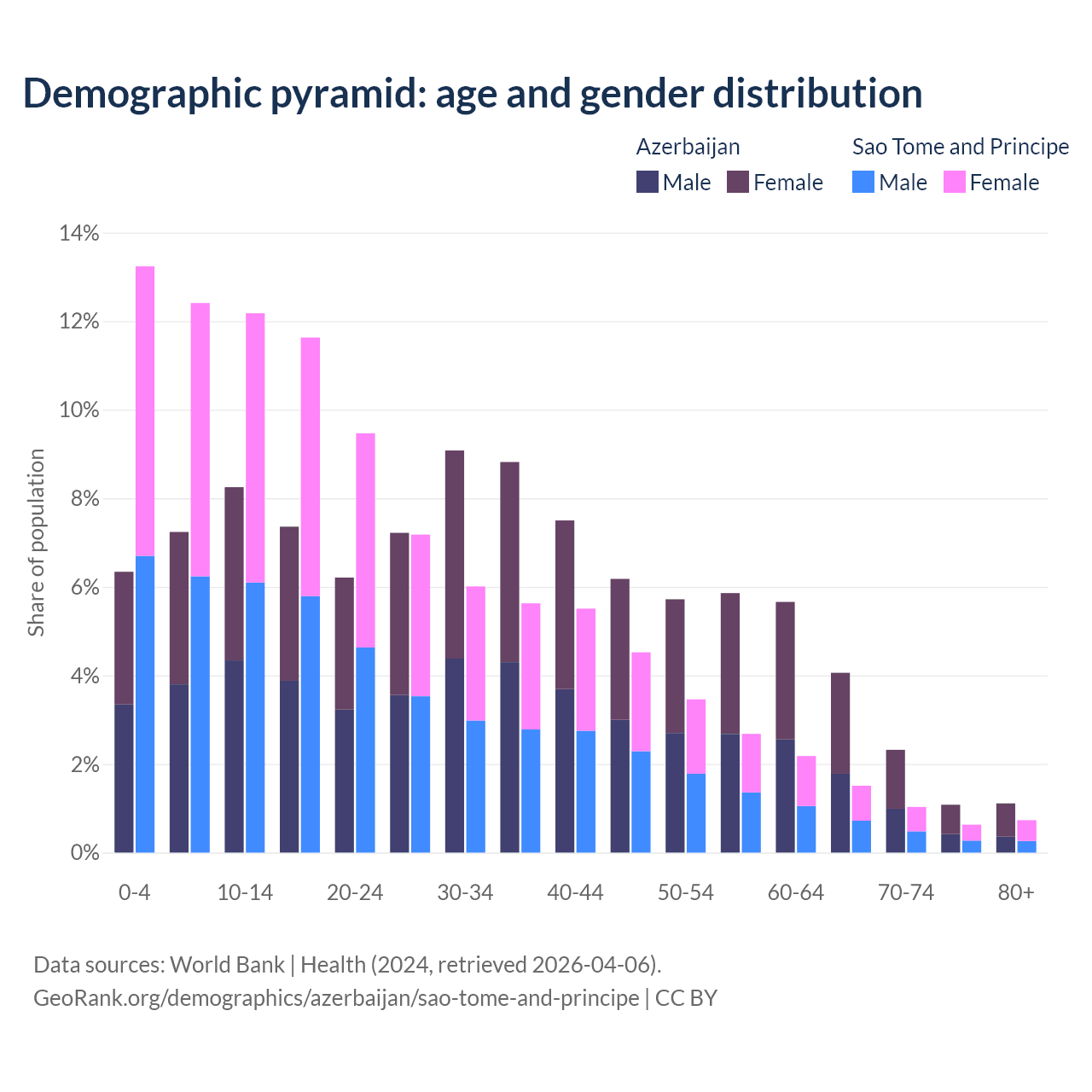 - Azerbaijan is ranked 82/196 by median age (oldest to youngest) vs 163/196 for Sao Tome and Principe.