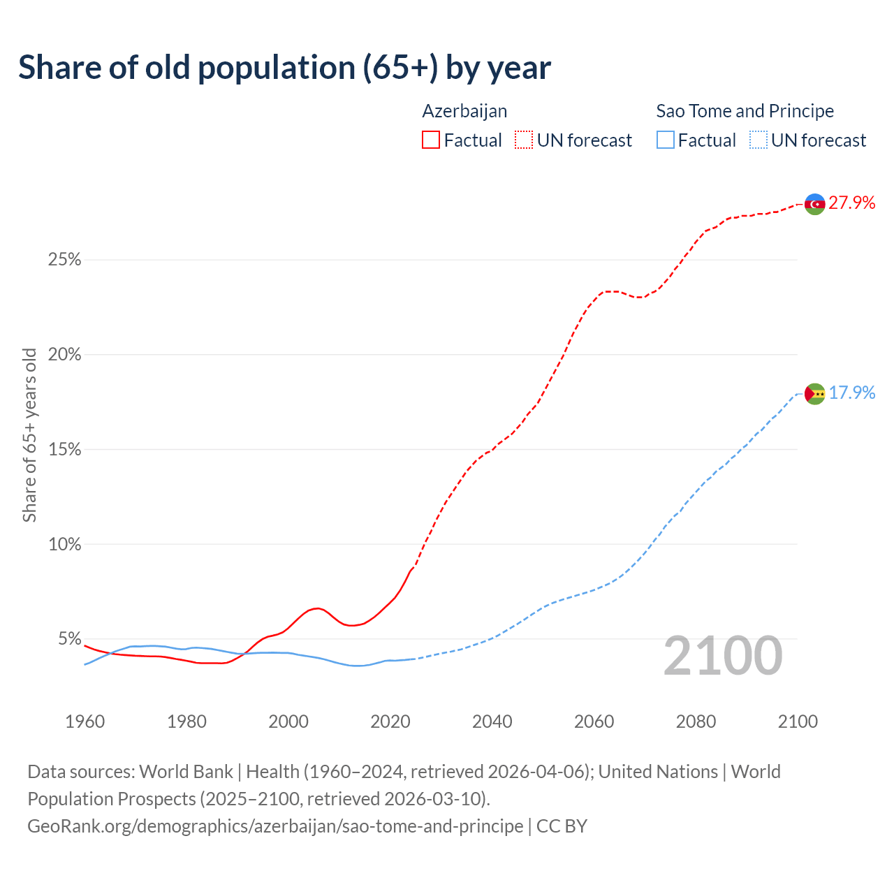 - The share of old-age demographic (65+) in Azerbaijan is 8.56% vs 3.9% in Sao Tome and Principe.