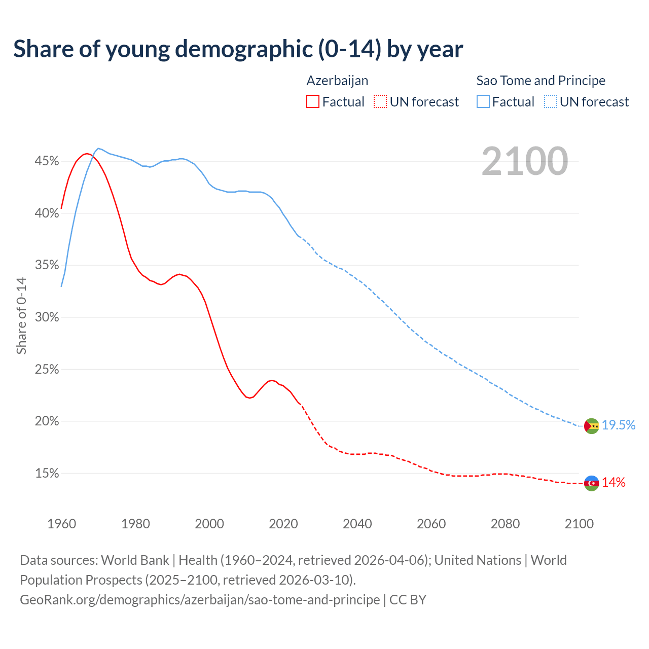 - The share of young demographic (0-15 years old) in Azerbaijan is 21.8% vs 37.8% in Sao Tome and Principe.