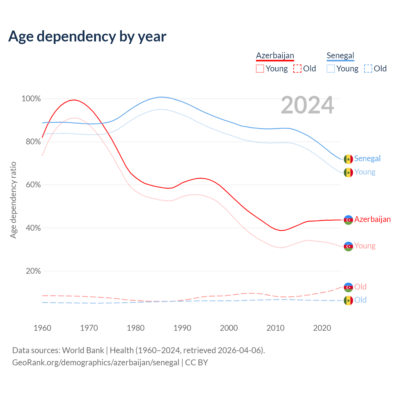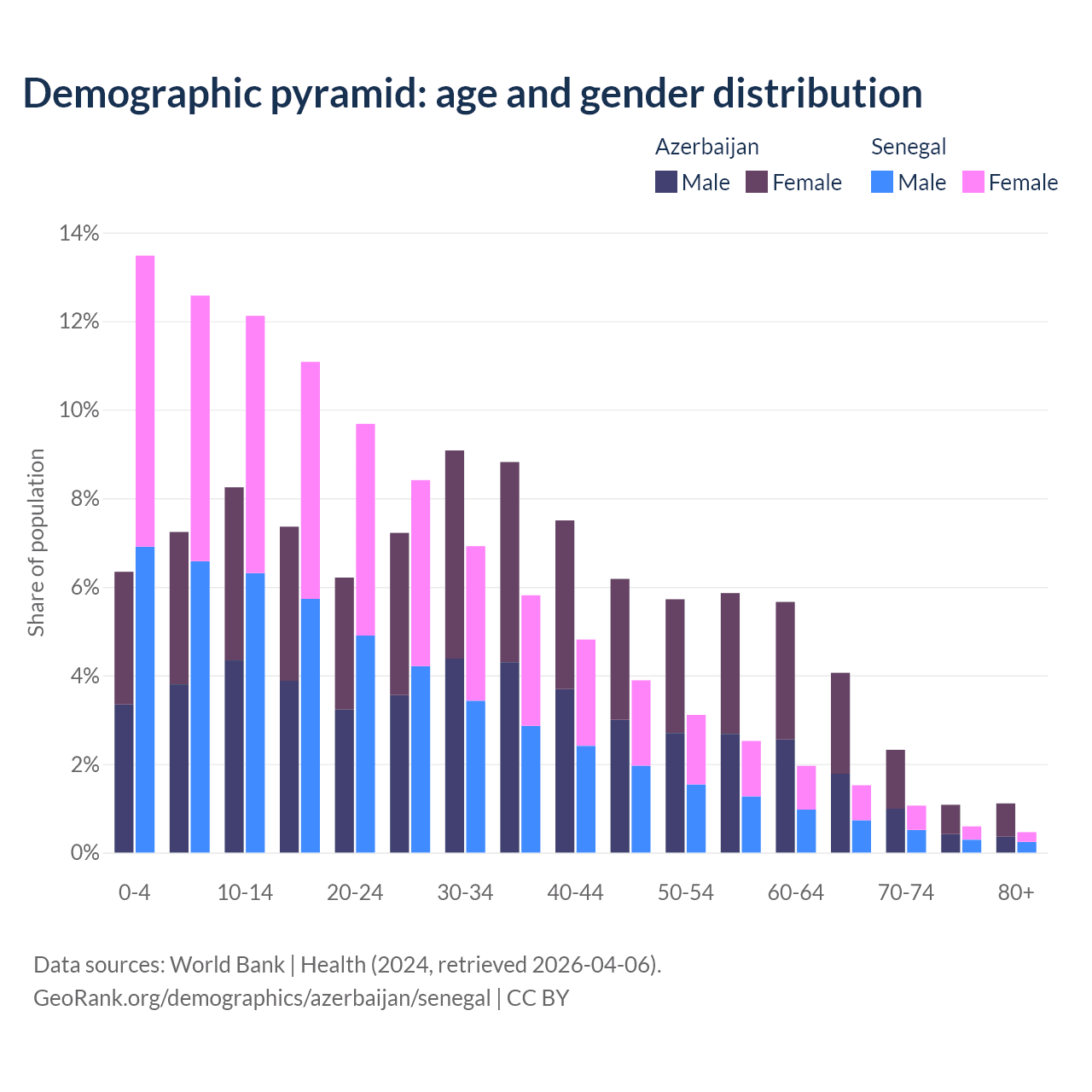 - Azerbaijan is ranked 82/196 by median age (oldest to youngest) vs 162/196 for Senegal.