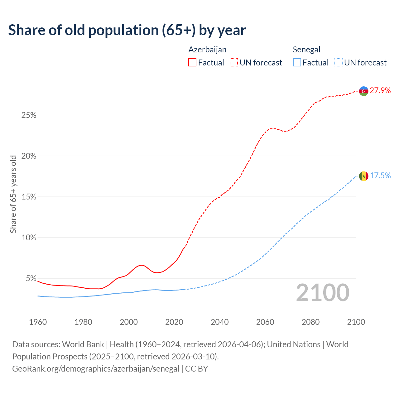 The share of older people aged 65 and over is 8.56% in Azerbaijan and 3.62% in Senegal. Life expectancy in Azerbaijan compared to Senegal .