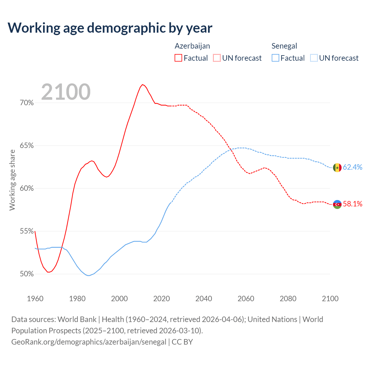 Median age Azerbaijan vs Senegal, 1960-2100