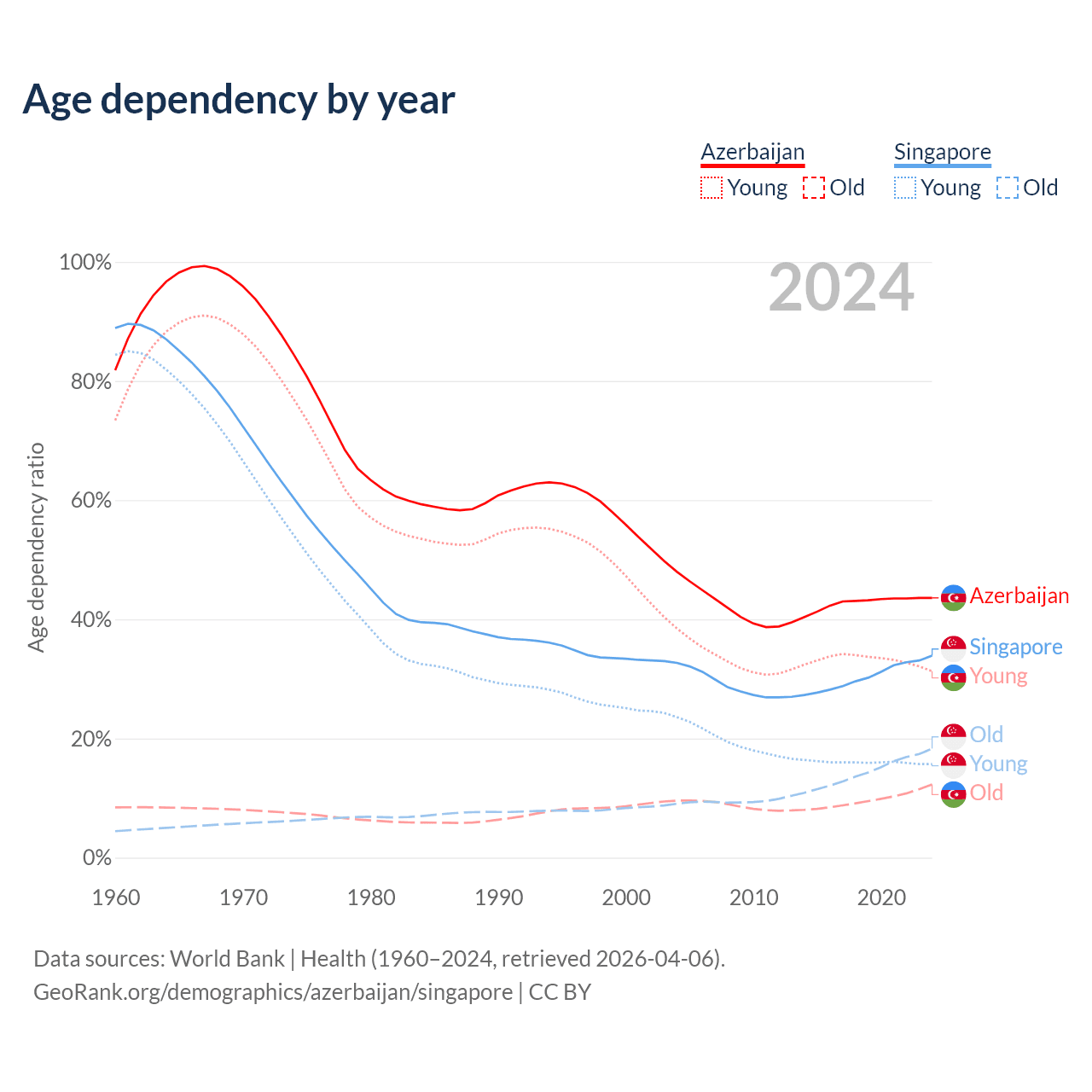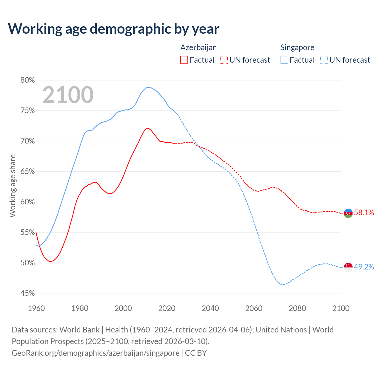 Median age Azerbaijan vs Singapore, 1960-2100