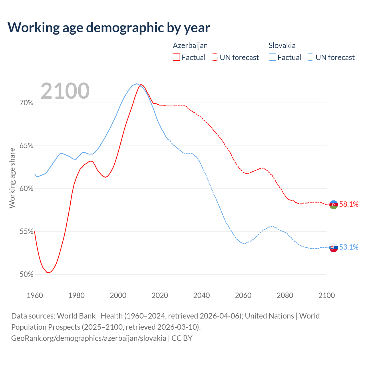 Median age Azerbaijan vs Slovakia, 1960-2100