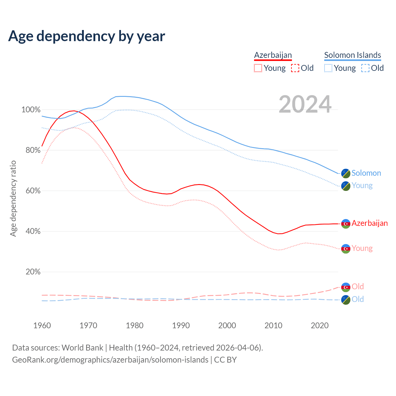 - Azerbaijan is ranked 82/196 by median age (oldest to youngest) vs 153/196 for the Solomon Islands.