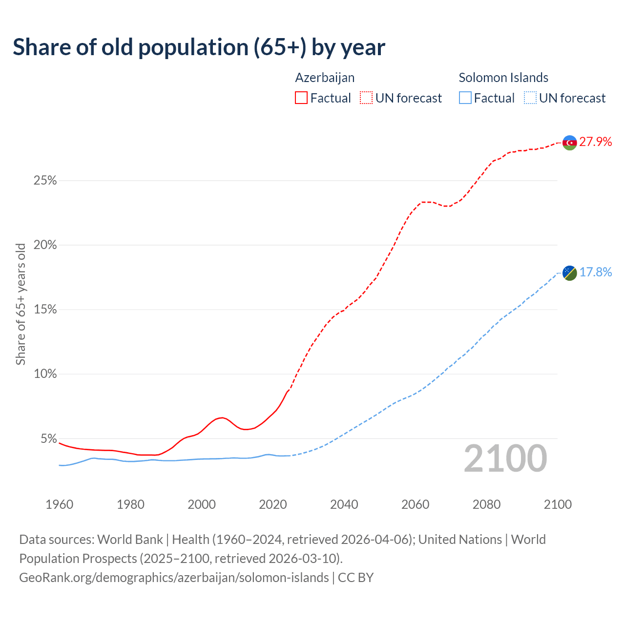 The share of older people aged 65 and over is 8.56% in Azerbaijan and 3.64% in the Solomon Islands. Life expectancy in Azerbaijan compared to the Solomon Islands .