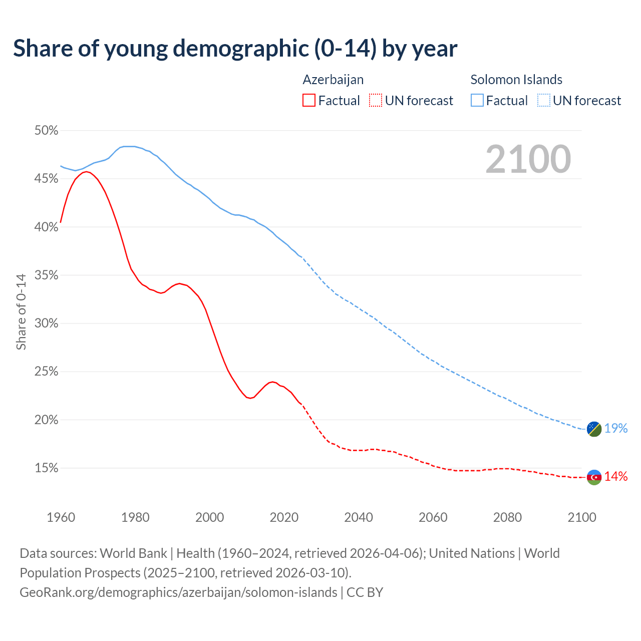 - The share of young demographic (0-15 years old) in Azerbaijan is 21.8% vs 37% in the Solomon Islands.