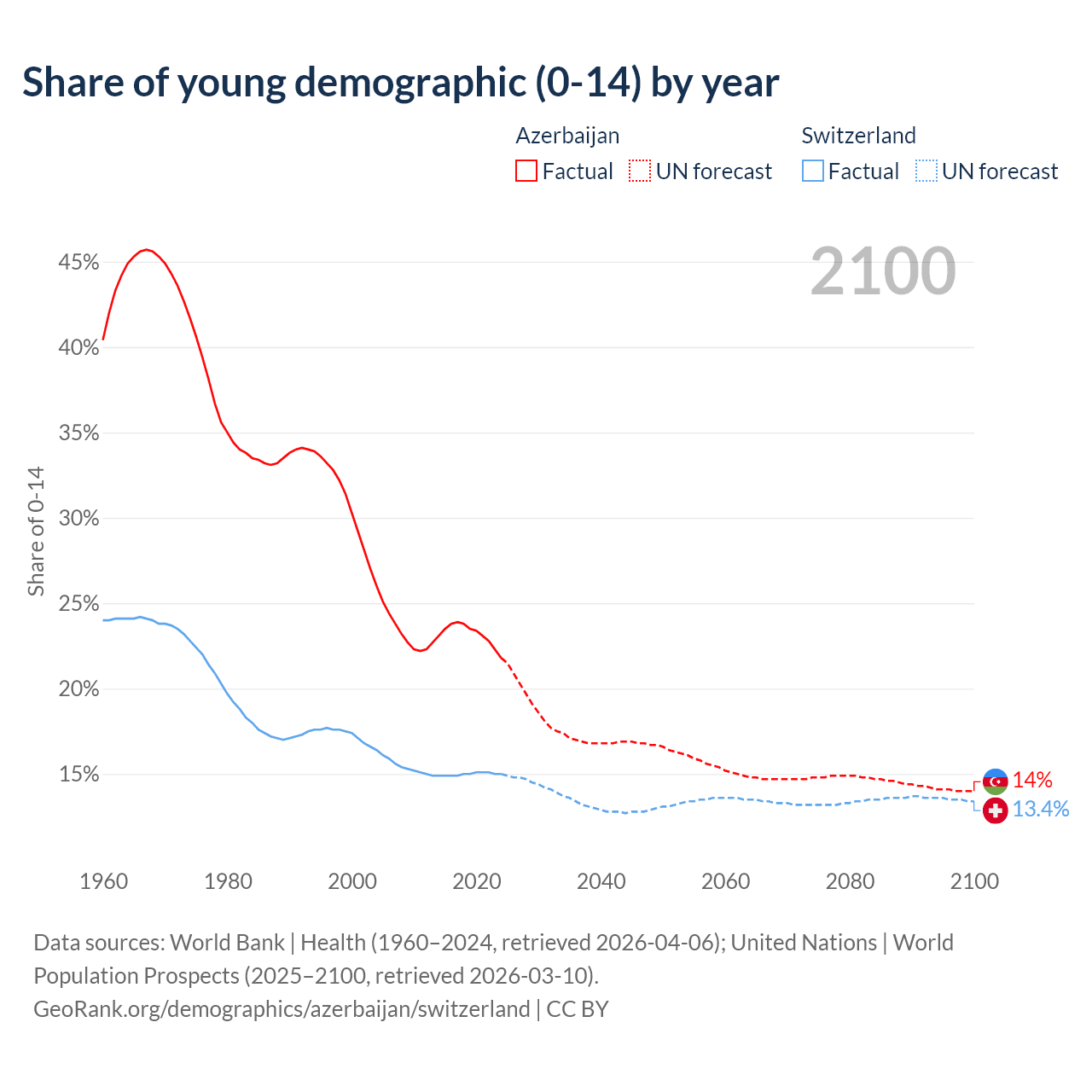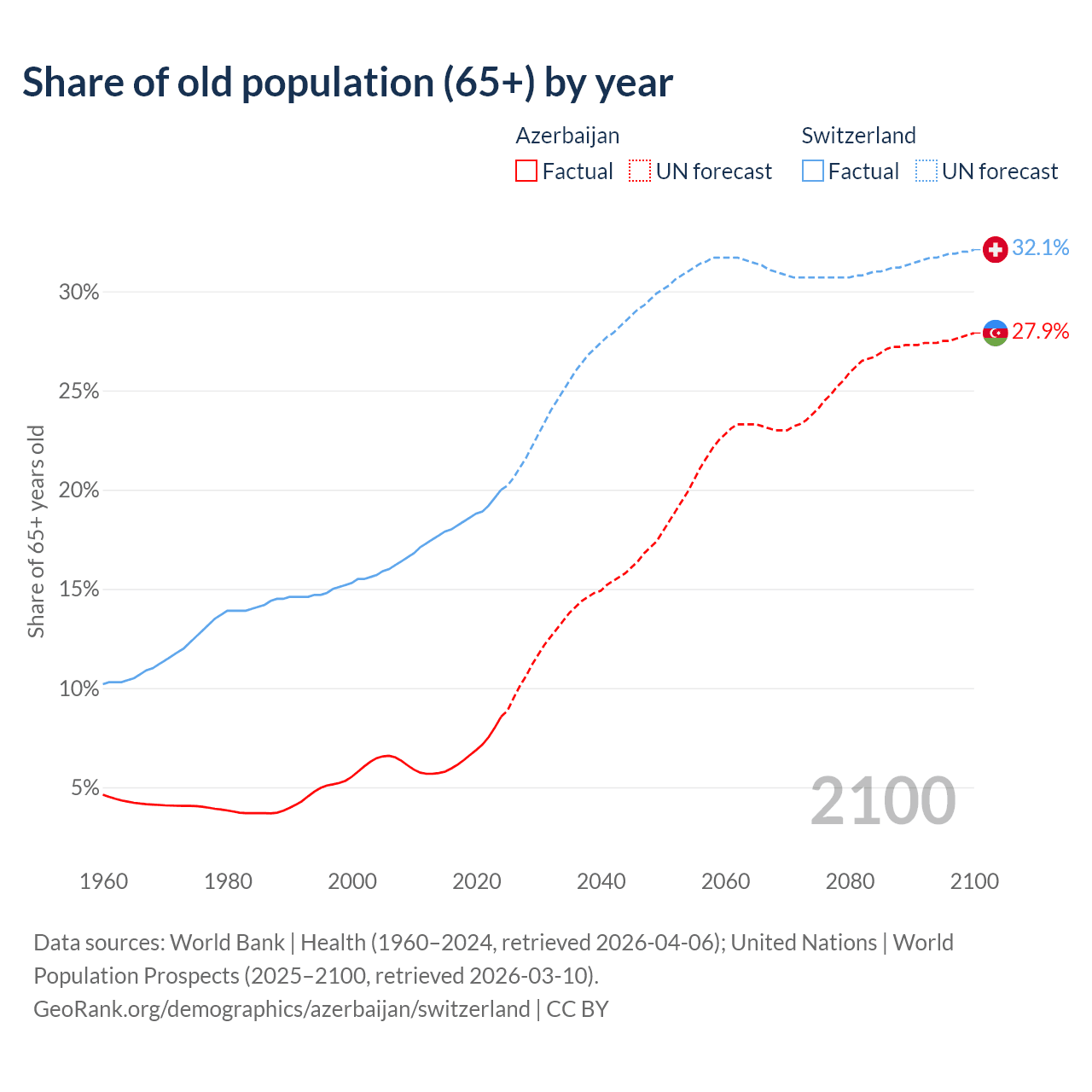 Median age Azerbaijan vs Switzerland, 1960-2100