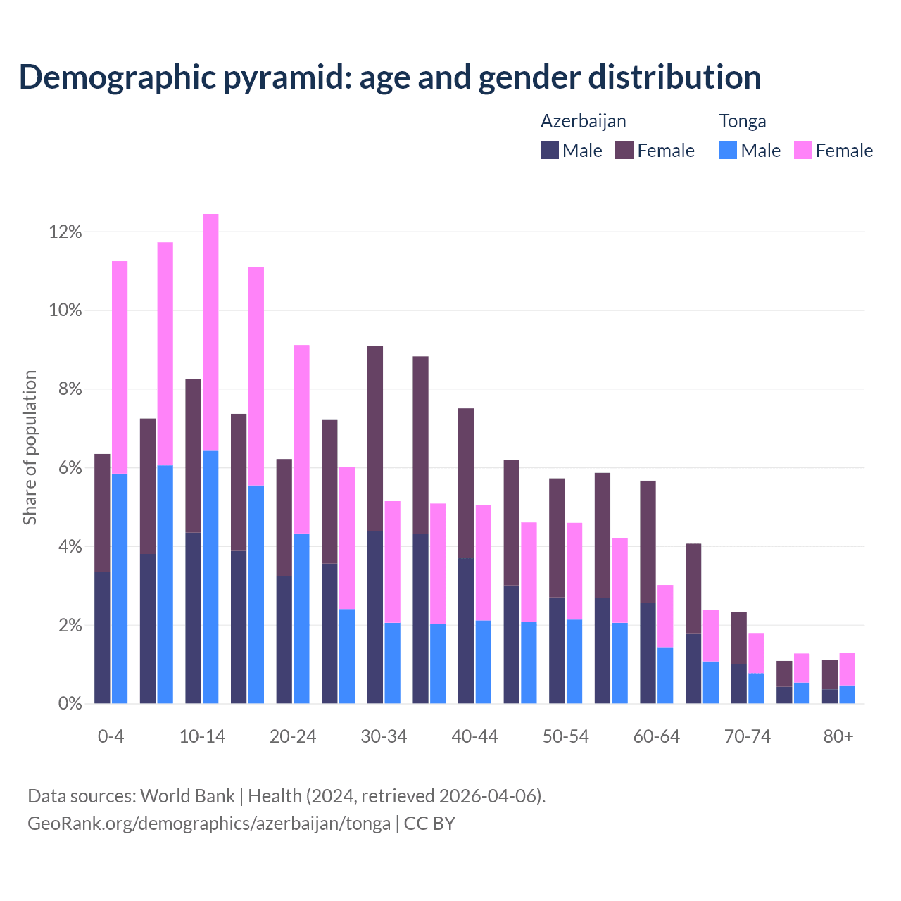 - As of 2026, the population of Azerbaijan is 10.3M vs 103K in Tonga - 100.1 times difference.