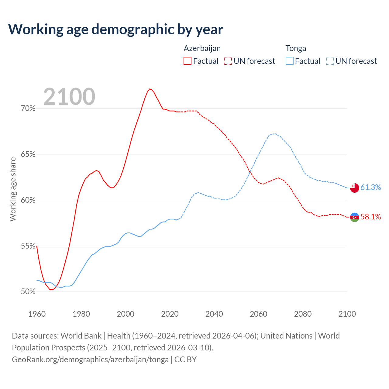 - Azerbaijan has 7.2M working age adults (aged 15-64) vs 59.8K in Tonga.