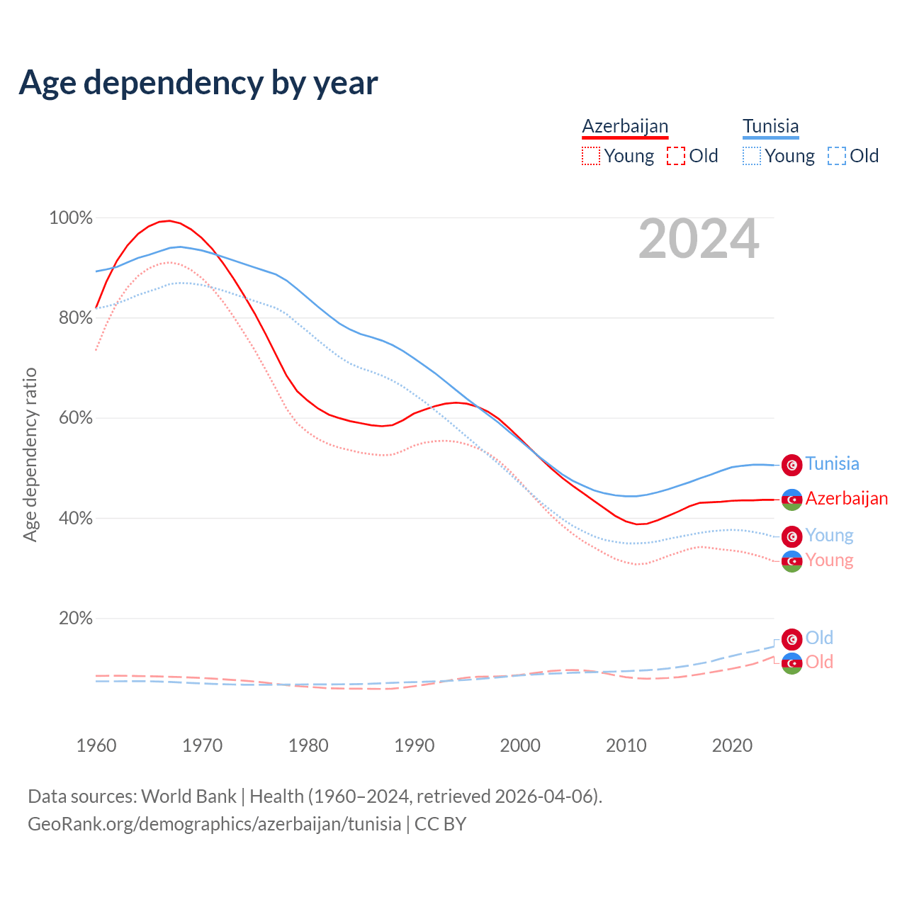 - The share of old-age demographic (65+) in Azerbaijan is 8.56% vs 9.53% in Tunisia.