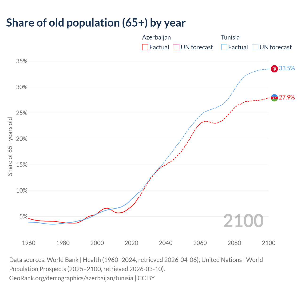The share of older people aged 65 and over is 8.56% in Azerbaijan and 9.53% in Tunisia. Life expectancy in Azerbaijan compared to Tunisia .