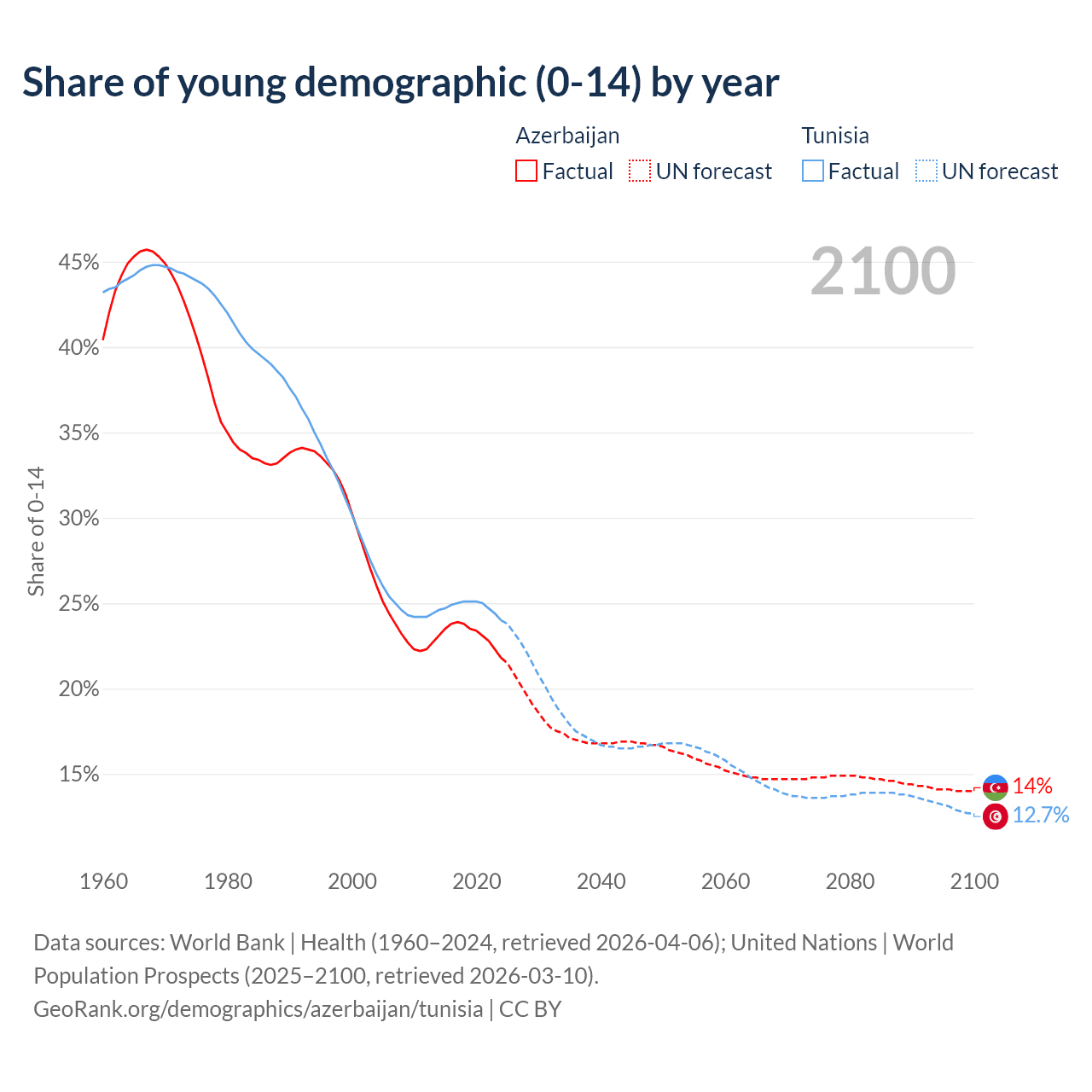 Median age Azerbaijan vs Tunisia, 1960-2100