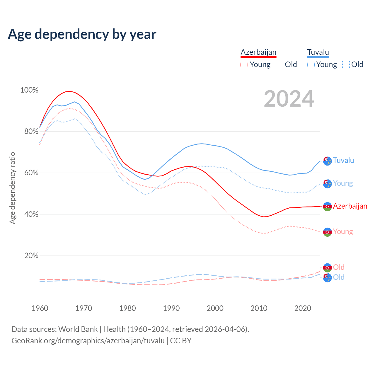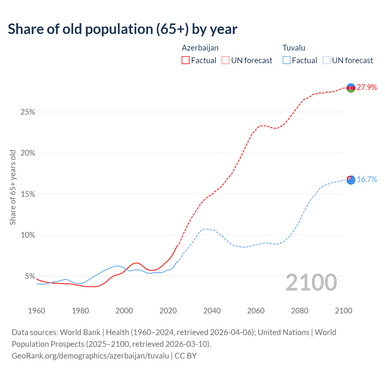 - The share of old-age demographic (65+) in Azerbaijan is 8.56% vs 6.67% in Tuvalu.