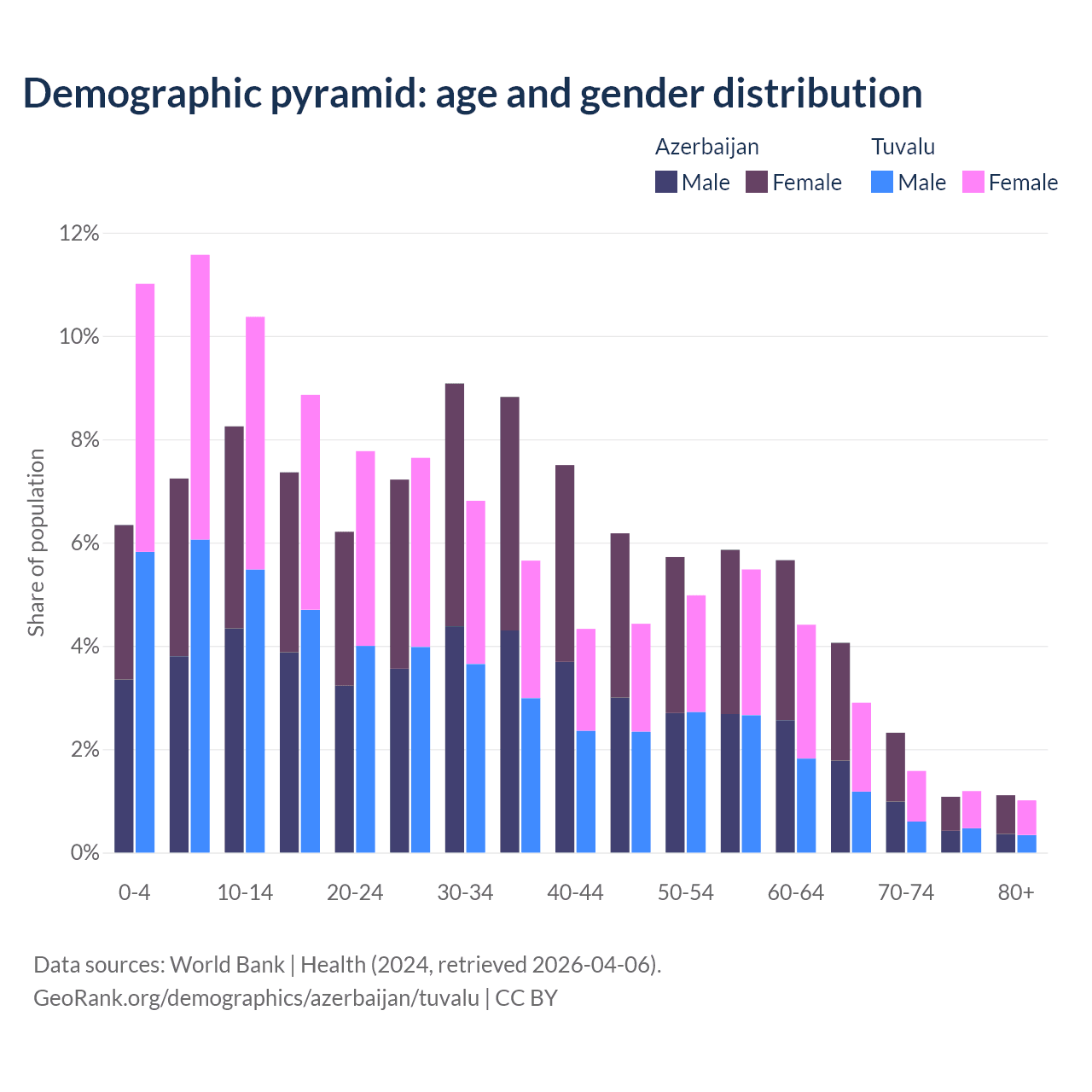- Azerbaijan is ranked 82/196 by median age (oldest to youngest) vs 132/196 for Tuvalu.