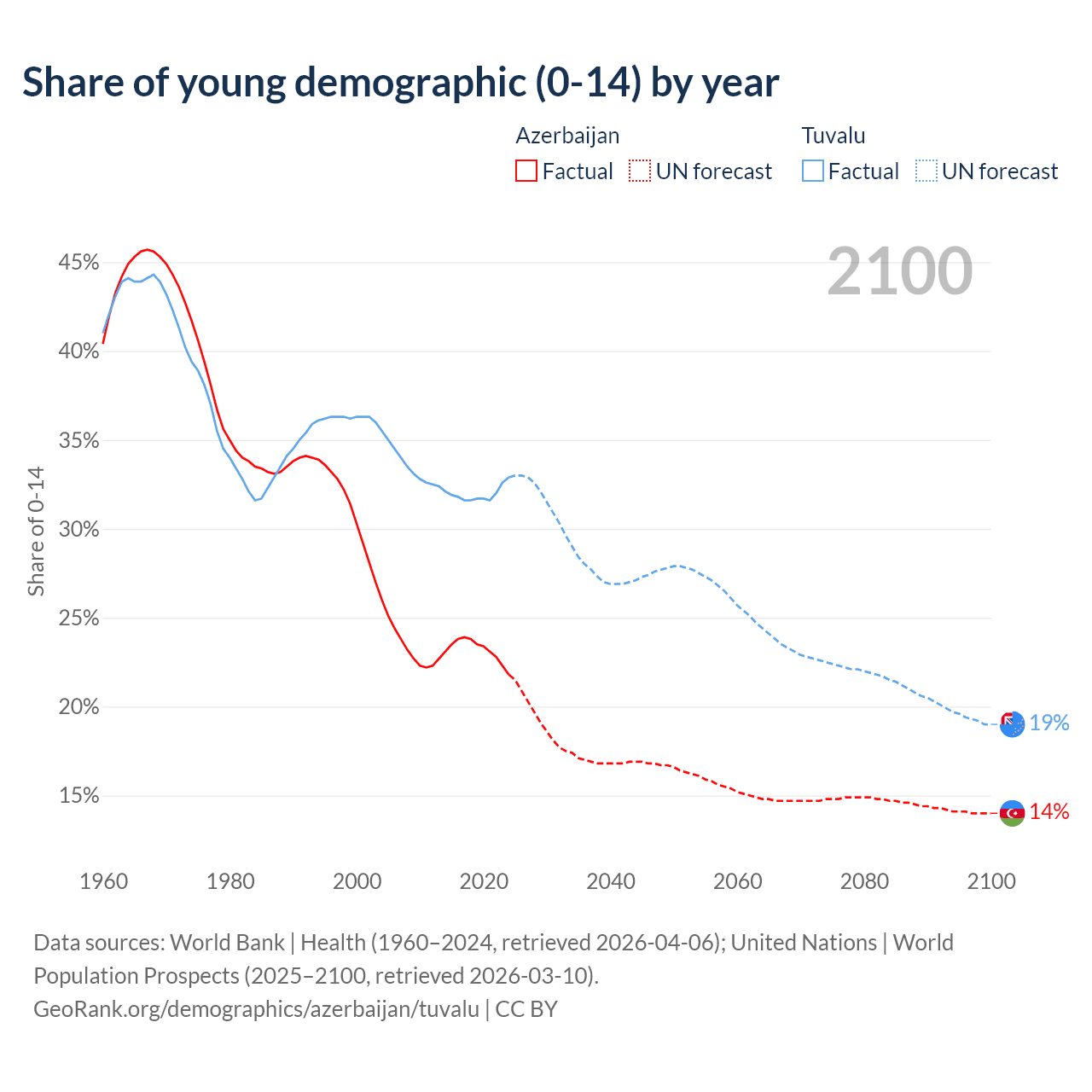 - The share of young demographic (0-15 years old) in Azerbaijan is 21.8% vs 32.9% in Tuvalu.