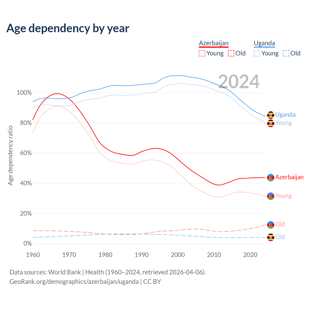 Data sources: World Bank | Health (1960–2024, retrieved 2026-04-06); U.S. Census Bureau (1960–2024, retrieved 2026-02-08).