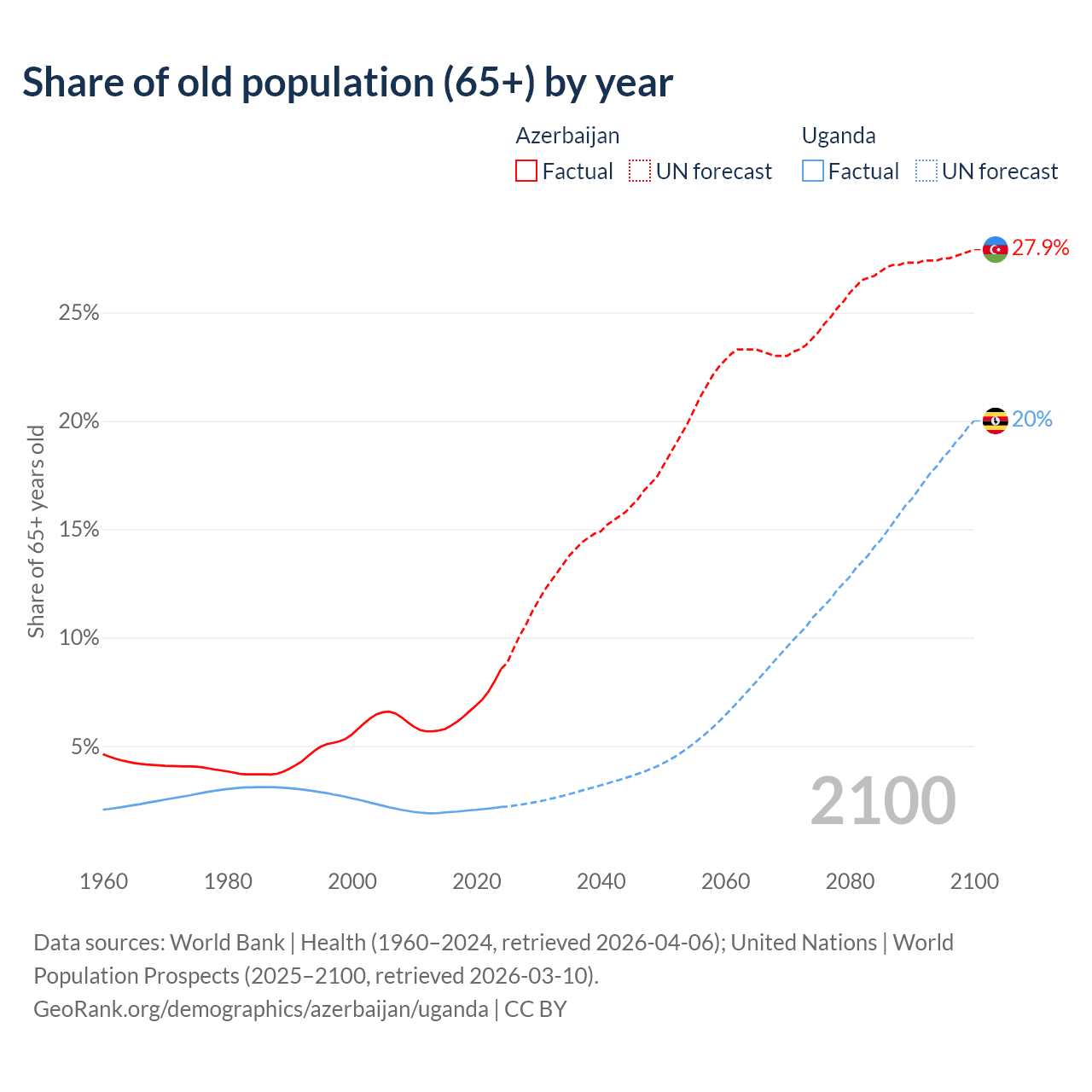 The share of older people aged 65 and over is 8.56% in Azerbaijan and 2.19% in Uganda. Life expectancy in Azerbaijan compared to Uganda .