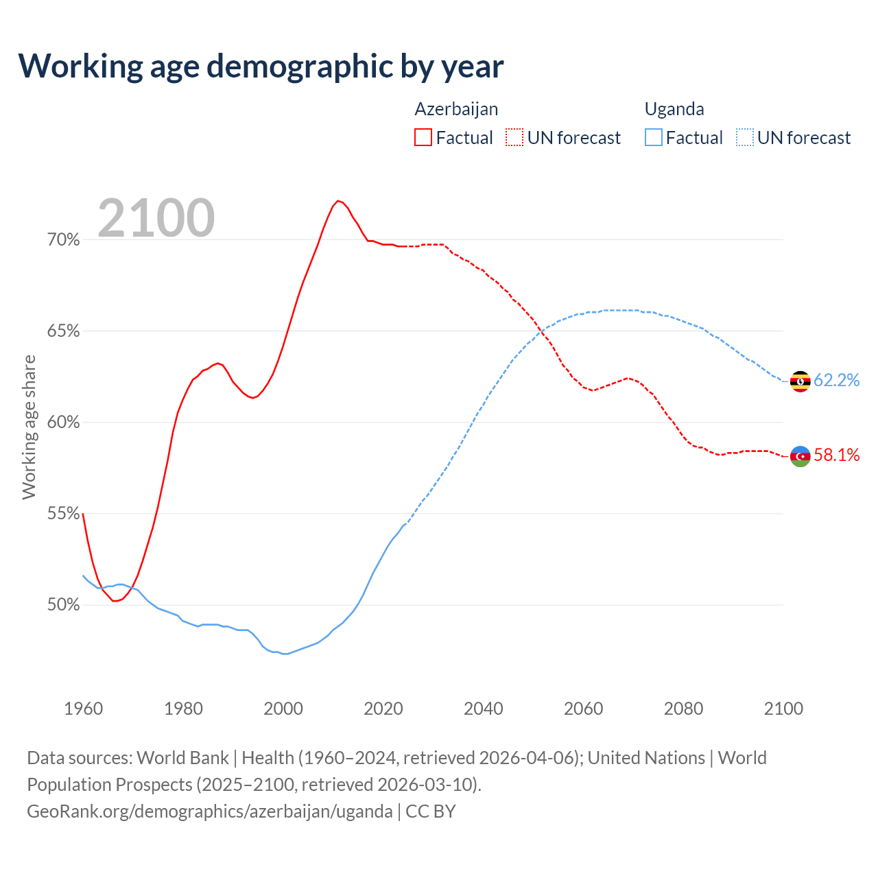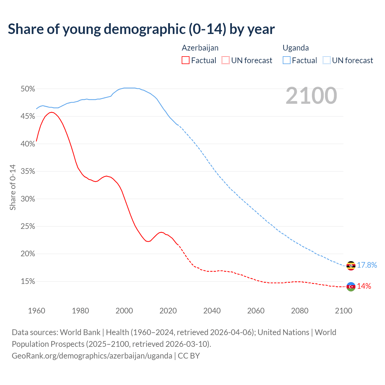 Median age Azerbaijan vs Uganda, 1960-2100