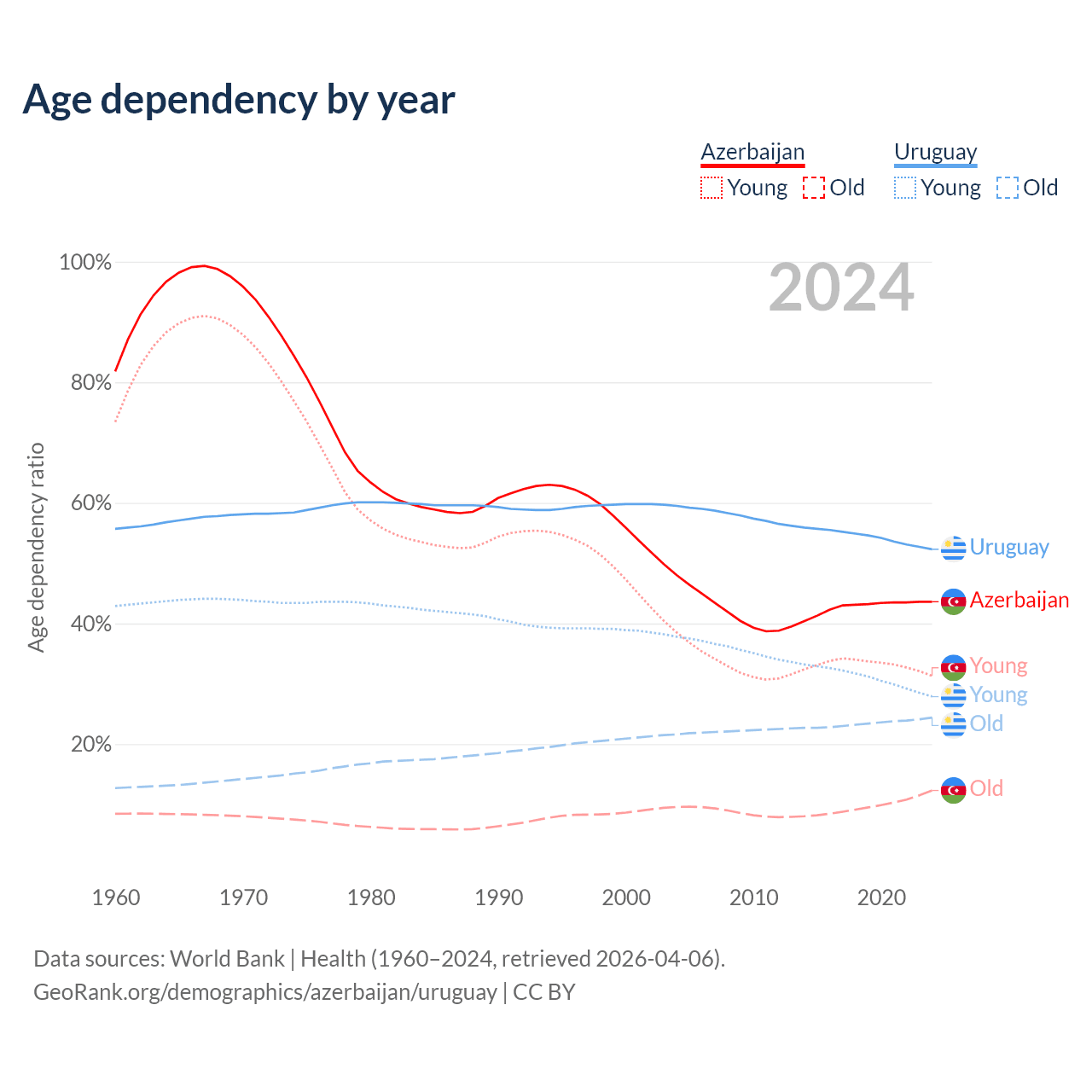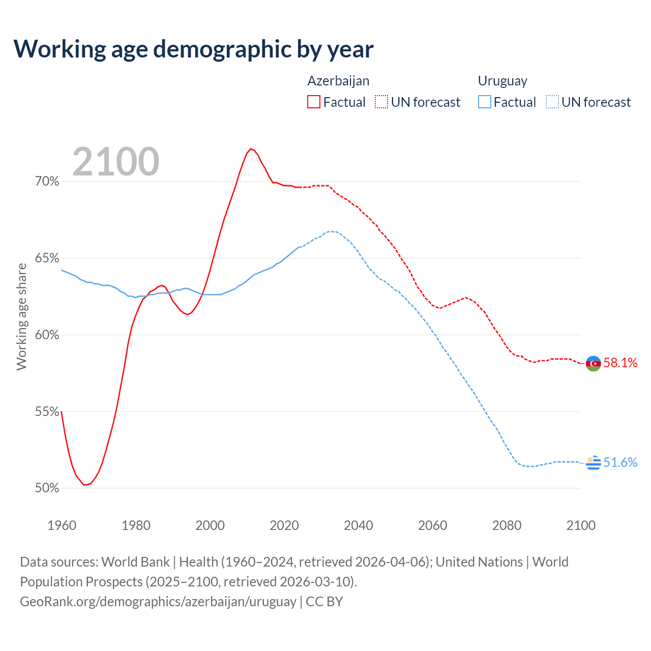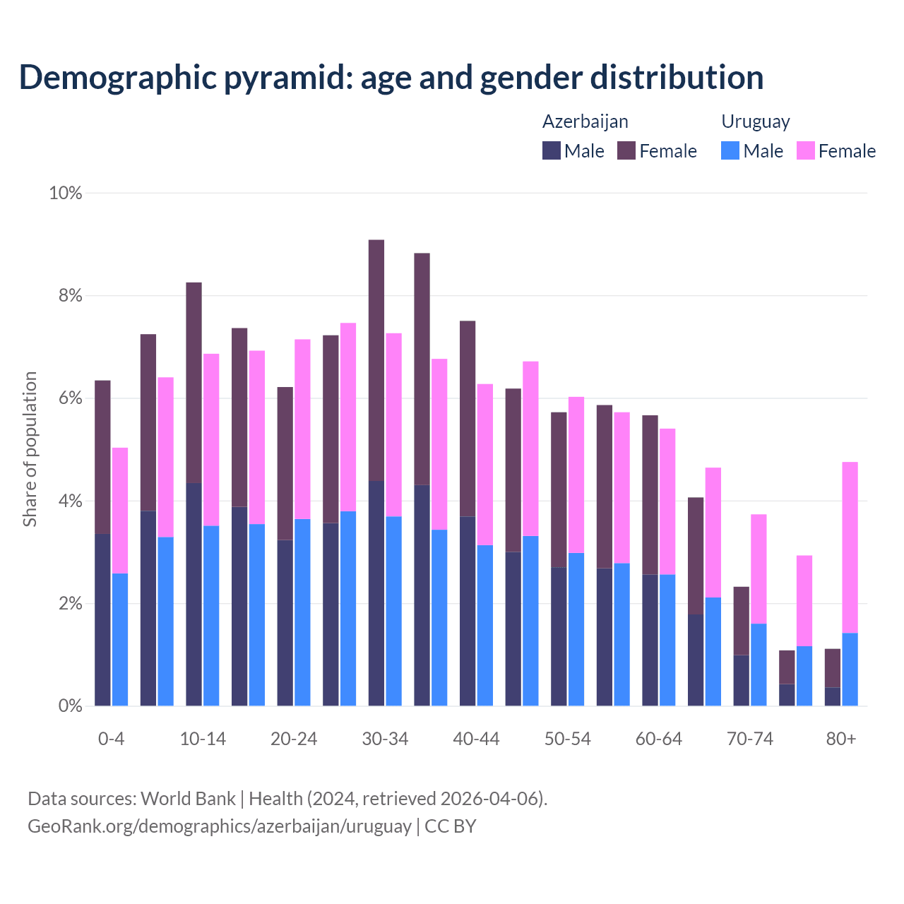 - Azerbaijan is ranked 82/196 by median age (oldest to youngest) vs 63/196 for Uruguay.