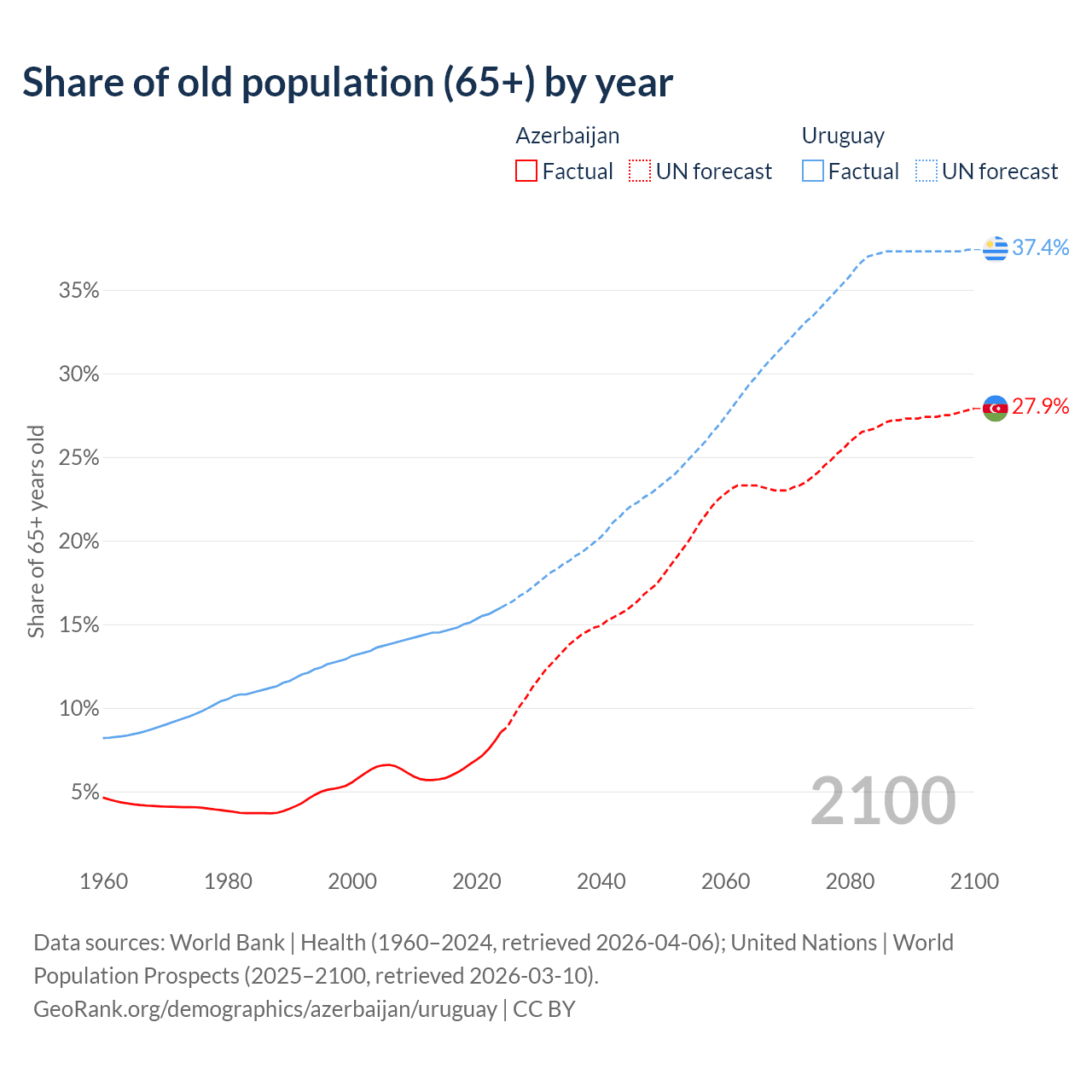 The share of older people aged 65 and over is 8.56% in Azerbaijan and 16% in Uruguay. Life expectancy in Azerbaijan compared to Uruguay .