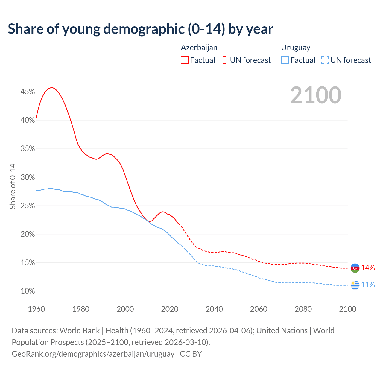 - The share of young demographic (0-15 years old) in Azerbaijan is 21.8% vs 18.3% in Uruguay.