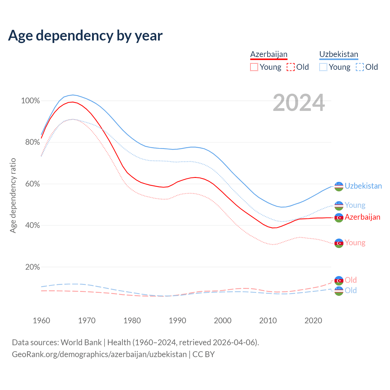 The share of older people aged 65 and over is 8.56% in Azerbaijan and 5.86% in Uzbekistan. Life expectancy in Azerbaijan compared to Uzbekistan .