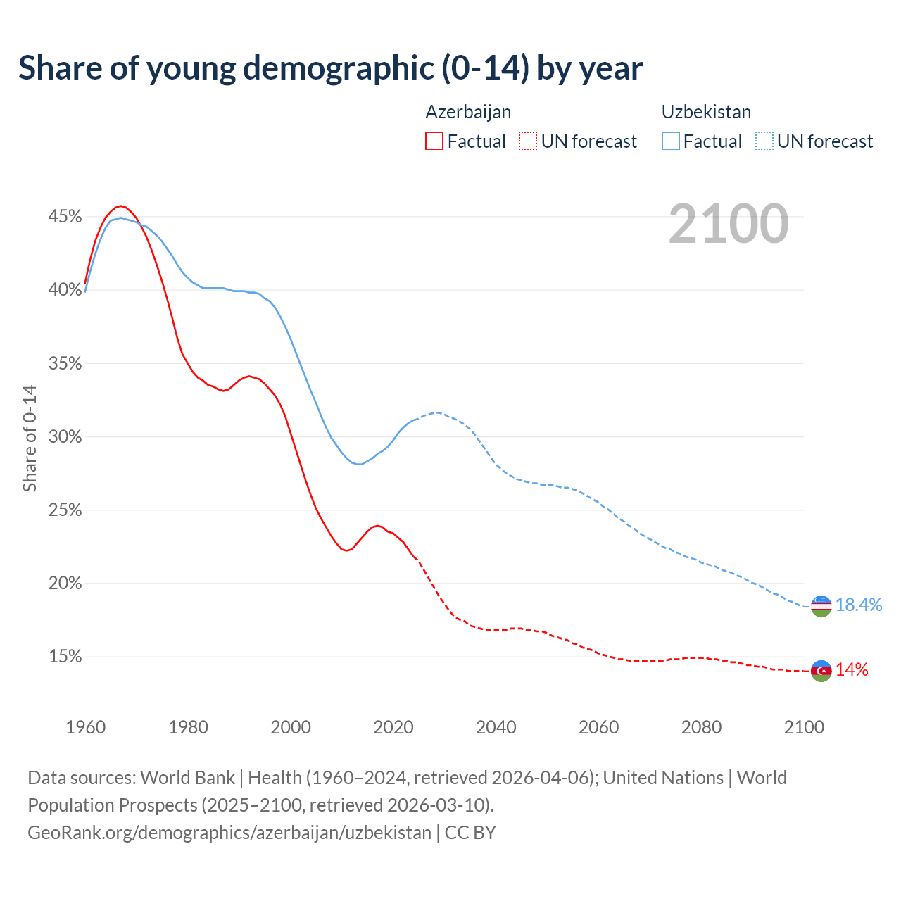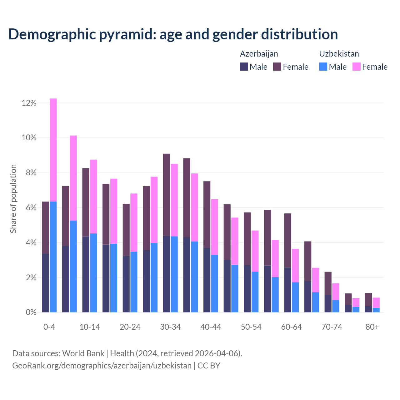 - Azerbaijan is ranked 82/196 by median age (oldest to youngest) vs 116/196 for Uzbekistan.