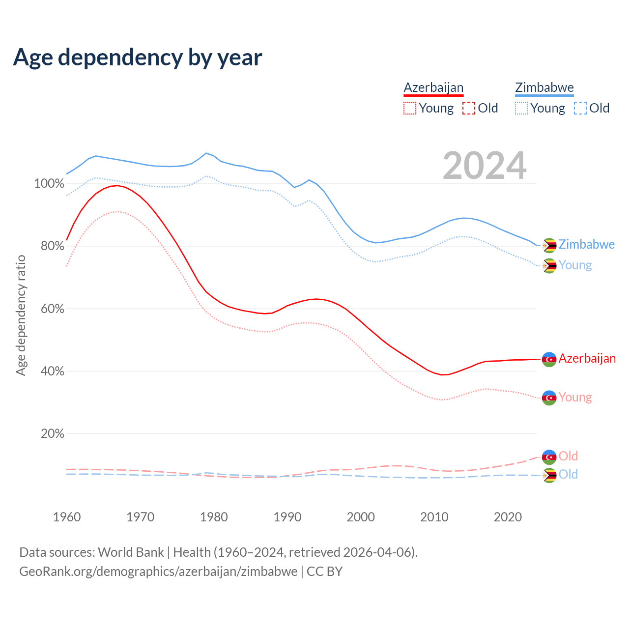 - Azerbaijan is ranked 82/196 by median age (oldest to youngest) vs 177/196 for Zimbabwe.
