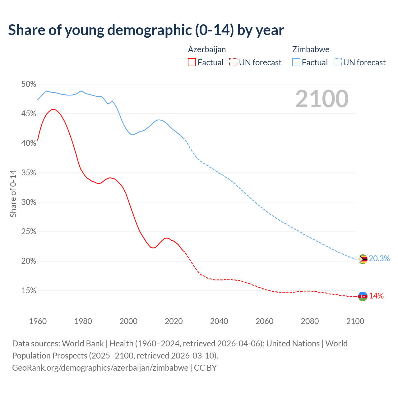 - The share of young demographic (0-15 years old) in Azerbaijan is 21.8% vs 40.9% in Zimbabwe.
