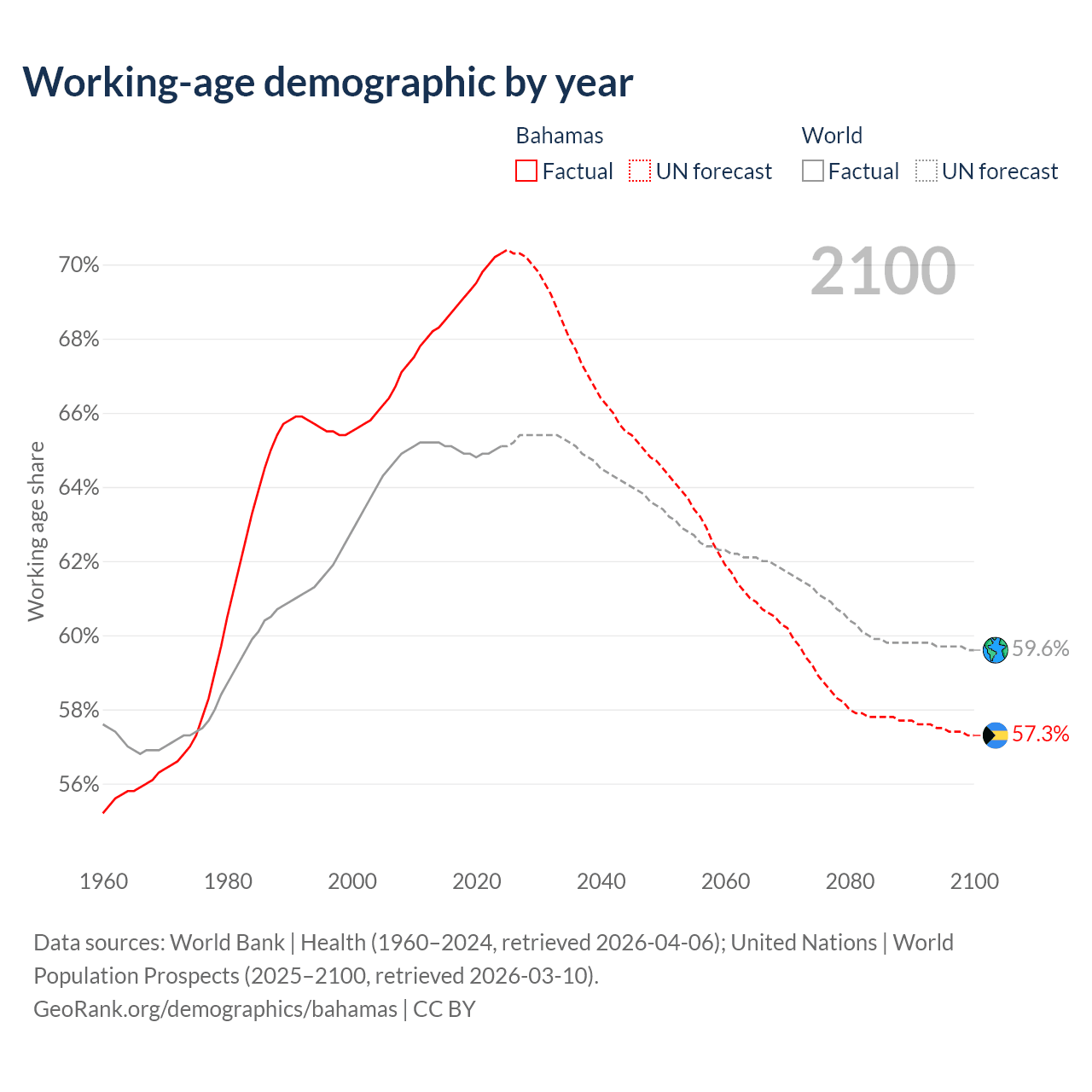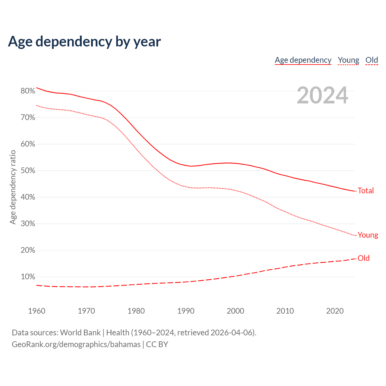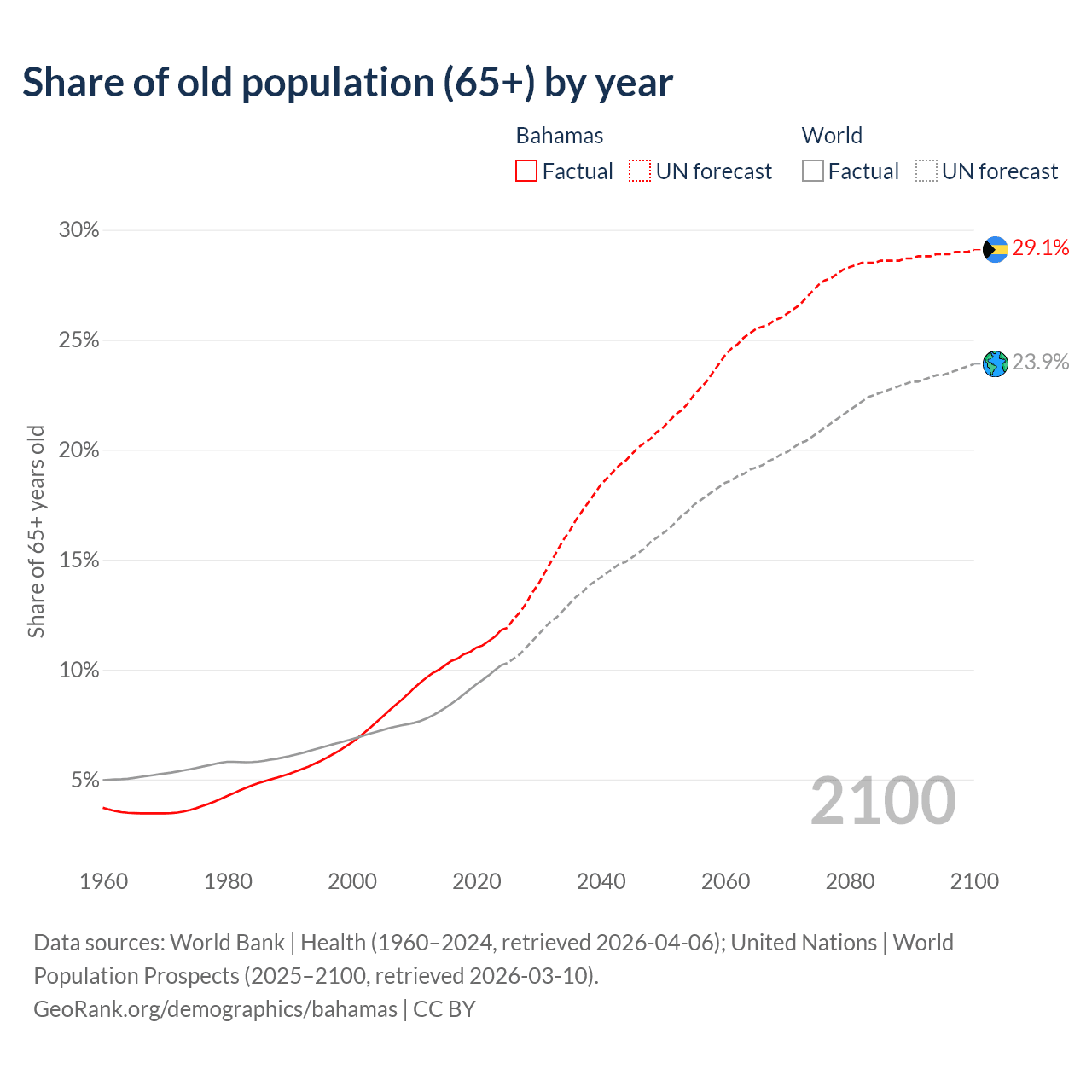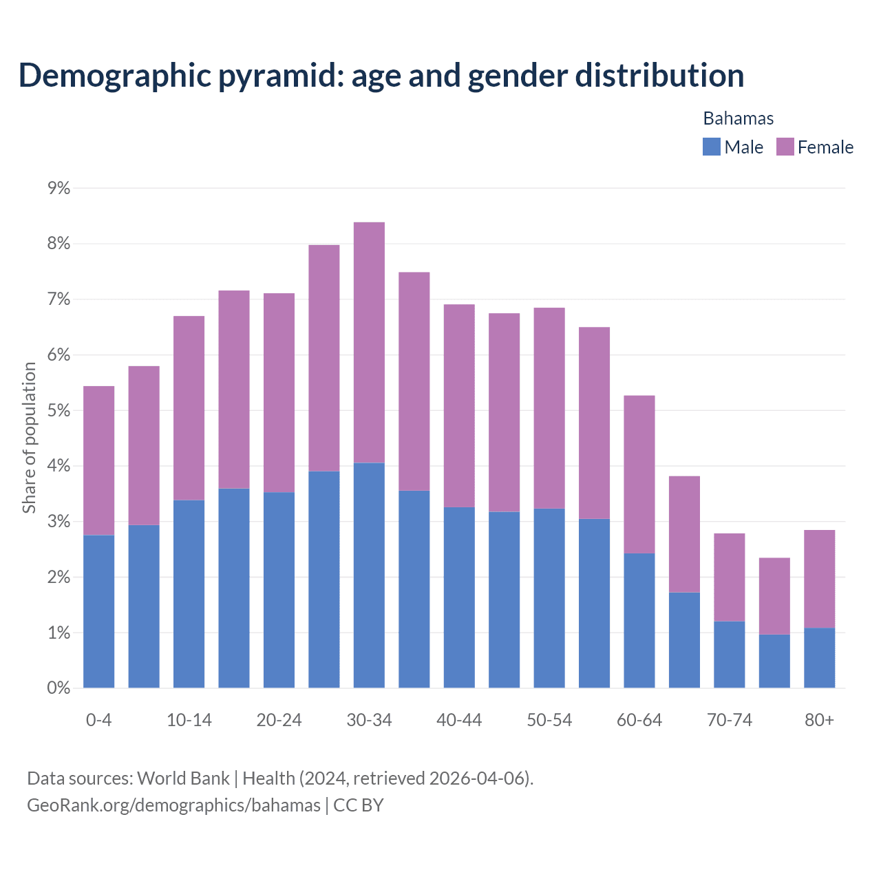 With a population of 401K people, the Bahamas has a median age of 36 years which makes it the 70/196 oldest country. 17.9% of the demographic are children 0-14 years old, 70.3% are working-age people aged 15-64, and 11.8% are older population aged 65+ years.