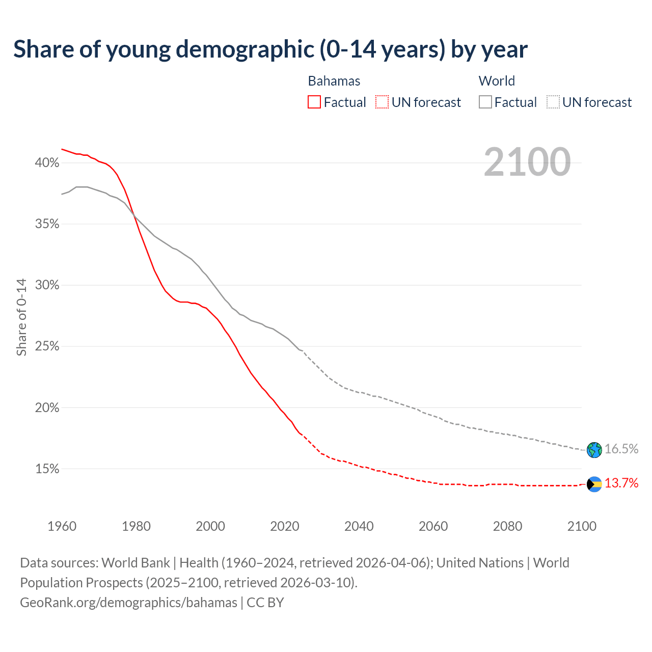 The share of children aged 0-14 in the Bahamas decreased from 26.3% to 17.9% between 2004 and 2024 due to changes in birth rates.