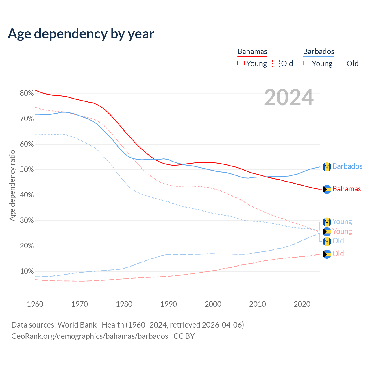 - The Bahamas is ranked 70/196 by median age (oldest to youngest) vs 47/196 for Barbados.