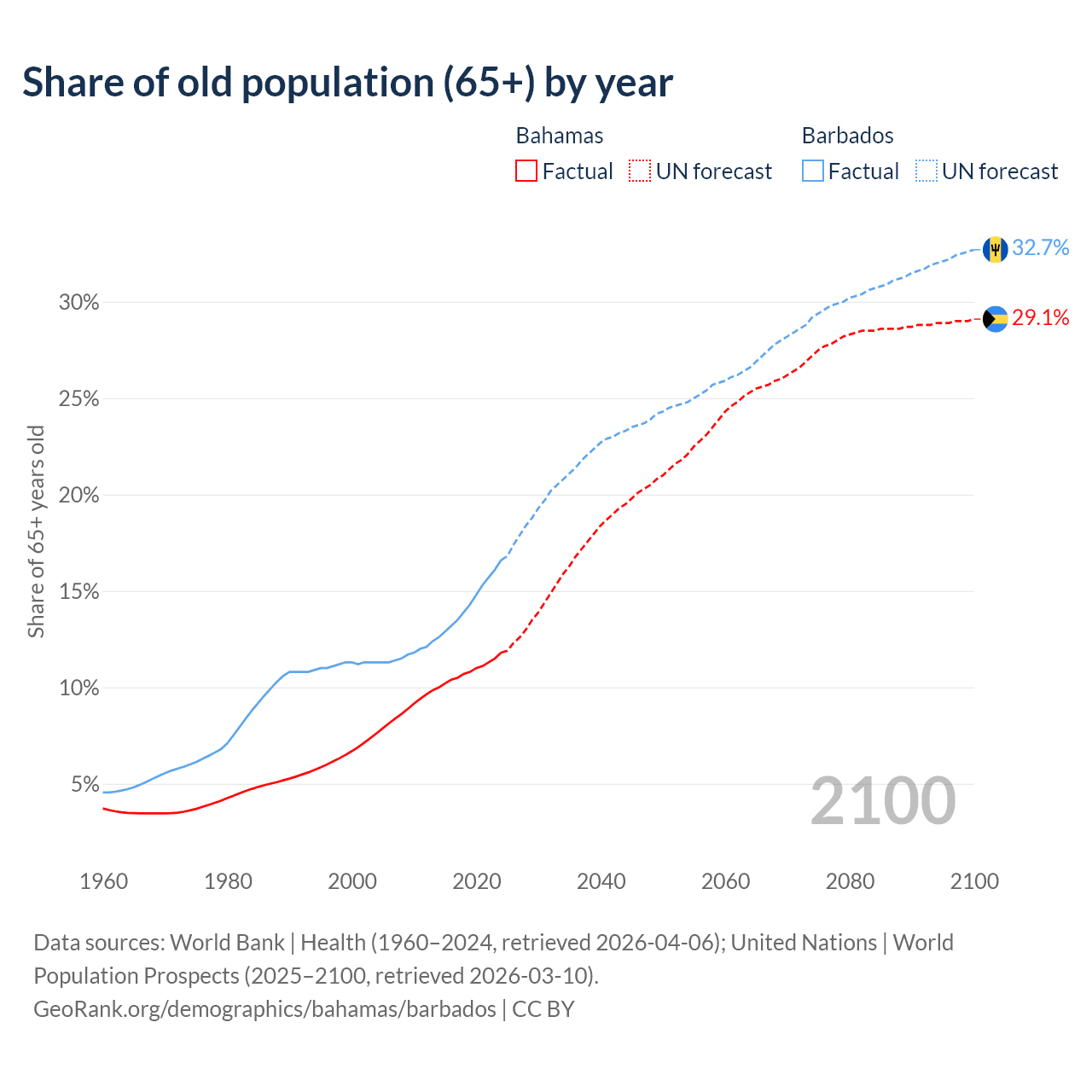 The share of older people aged 65 and over is 11.8% in the Bahamas and 16.6% in Barbados. Life expectancy in the Bahamas compared to Barbados .