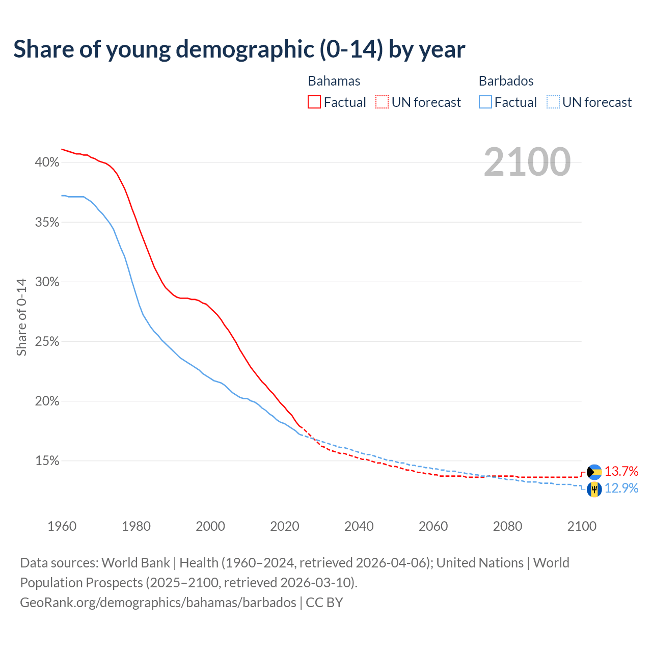 - The share of young demographic (0-15 years old) in the Bahamas is 17.9% vs 17.2% in Barbados.