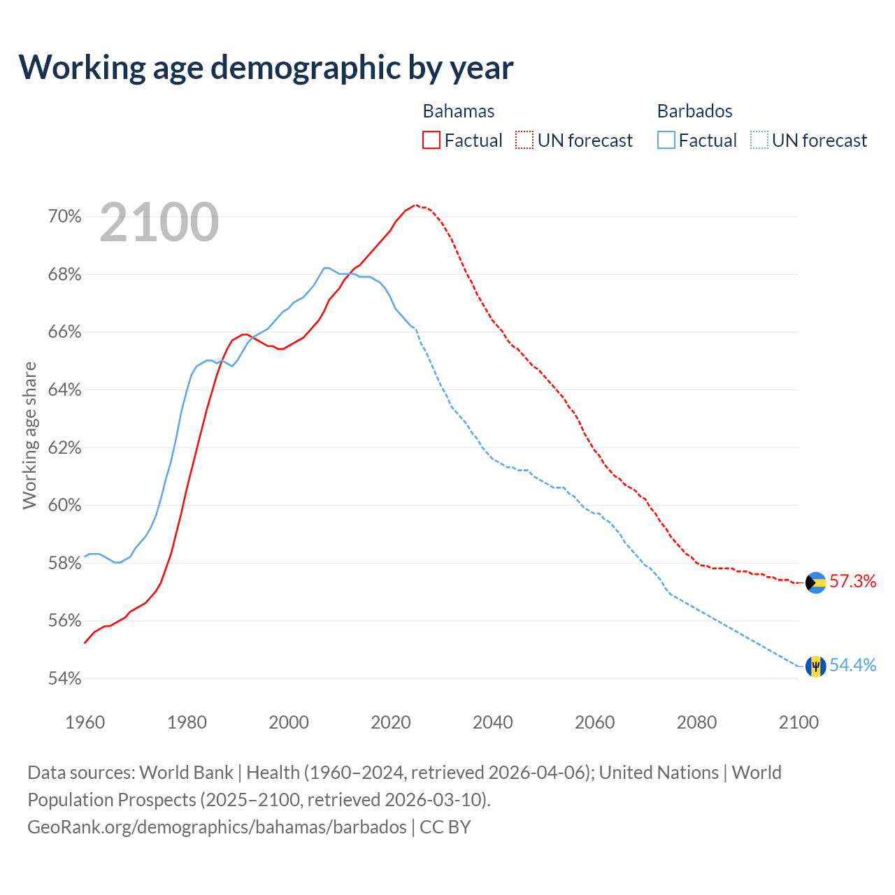 Median age Bahamas vs Barbados, 1960-2100