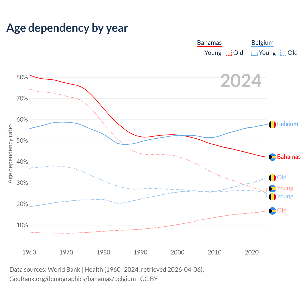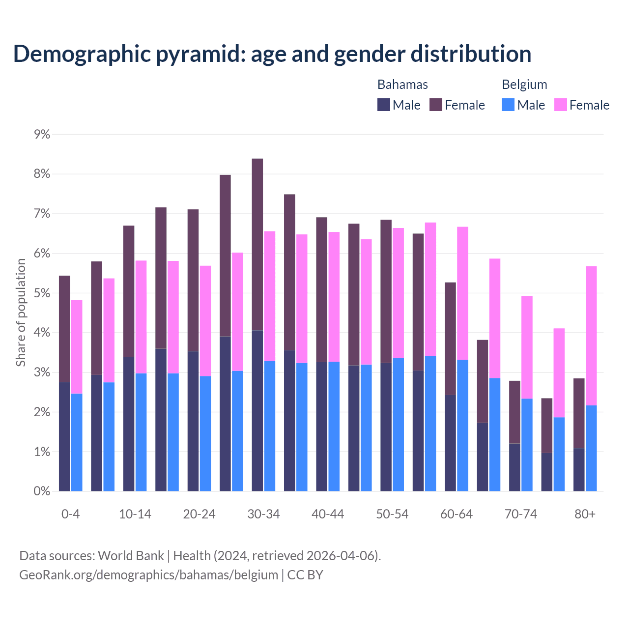 - The Bahamas is ranked 70/196 by median age (oldest to youngest) vs 32/196 for Belgium.