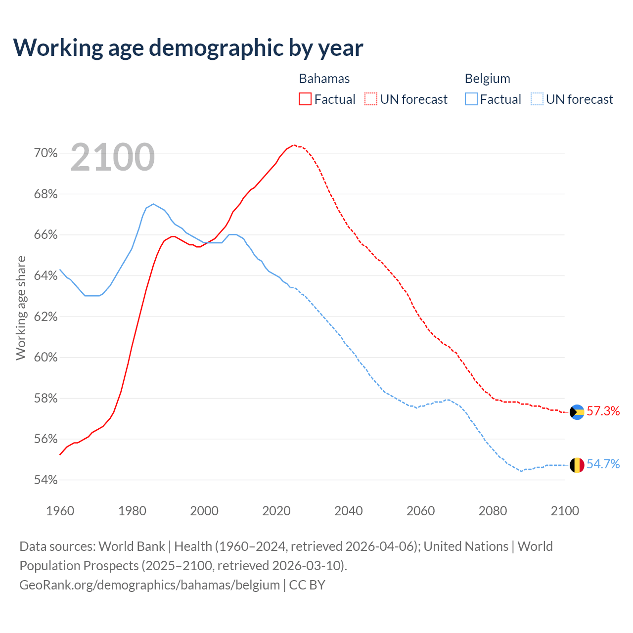 Median age Bahamas vs Belgium, 1960-2100