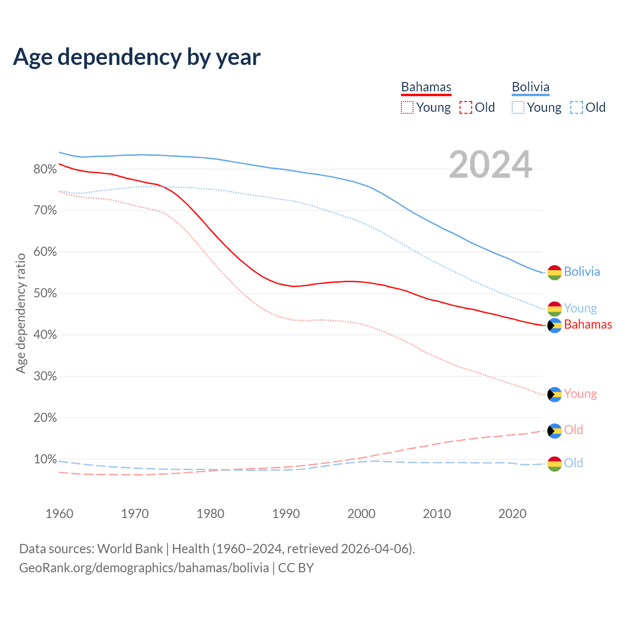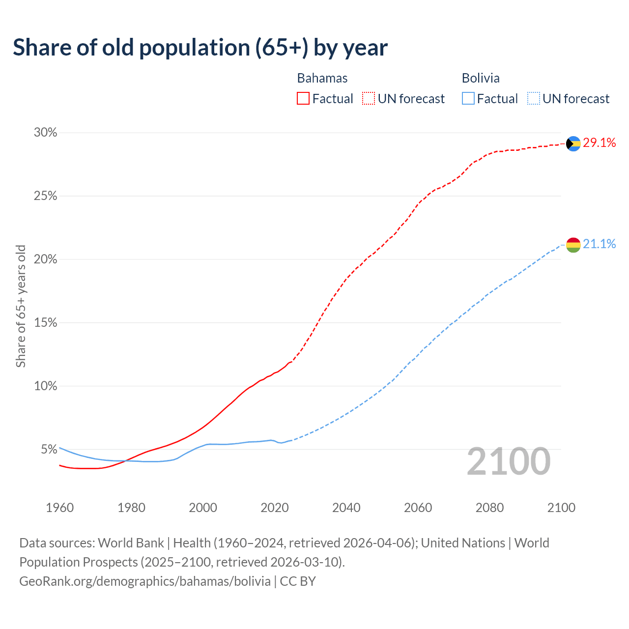 - The share of old-age demographic (65+) in the Bahamas is 11.8% vs 5.64% in Bolivia.