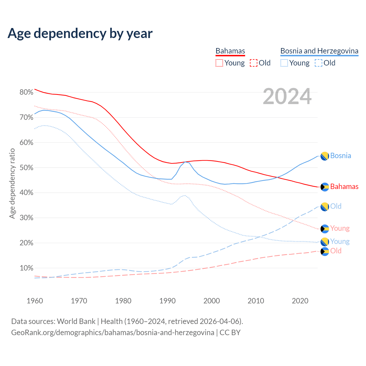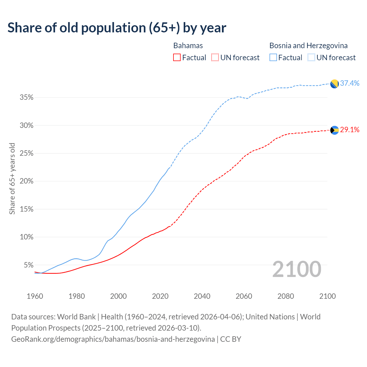 The share of older people aged 65 and over is 11.8% in the Bahamas and 22.2% in Bosnia and Herzegovina. Life expectancy in the Bahamas compared to Bosnia and Herzegovina .