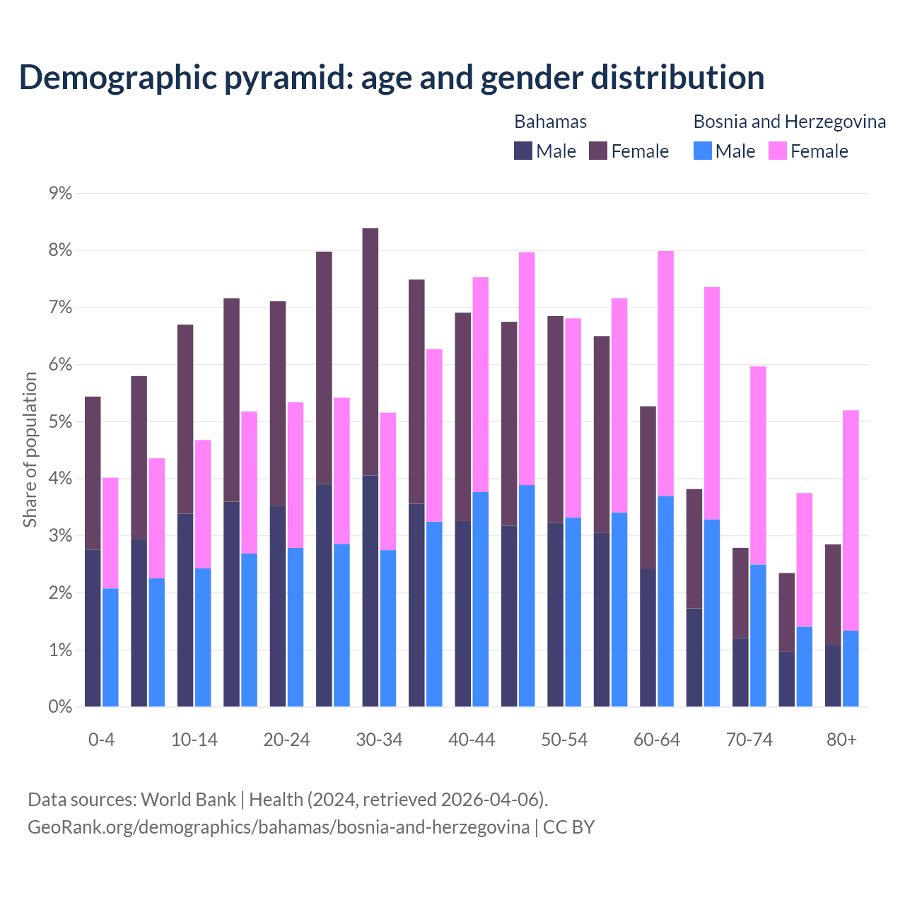 - The Bahamas is ranked 70/196 by median age (oldest to youngest) vs 8/196 for Bosnia and Herzegovina.